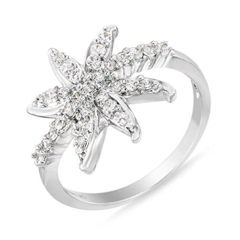 Elegant and luxurious rhodium plated ring featuring sparkling CZ stones. Perfect for adding glamour to any outfit.