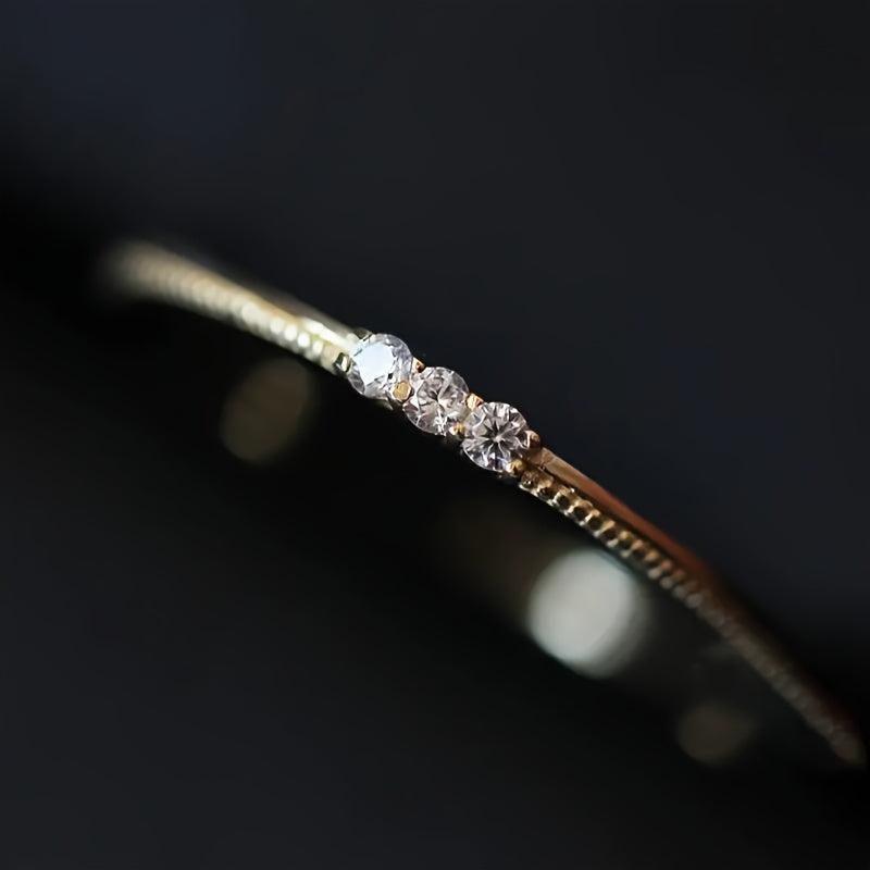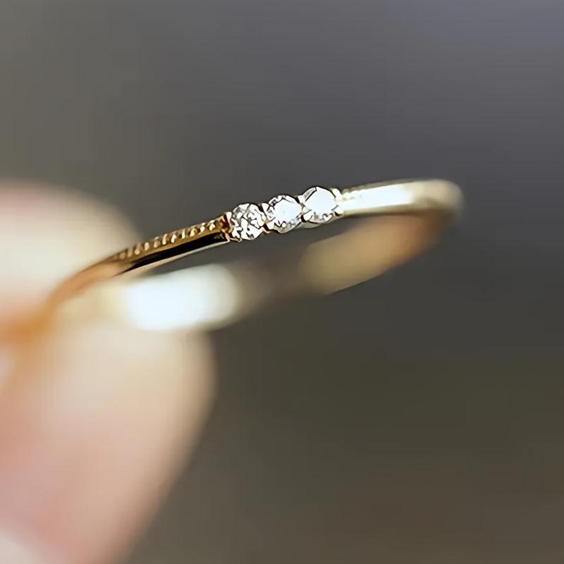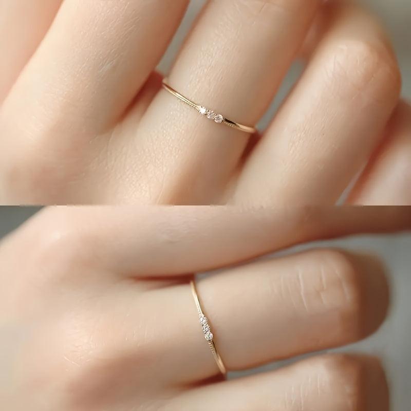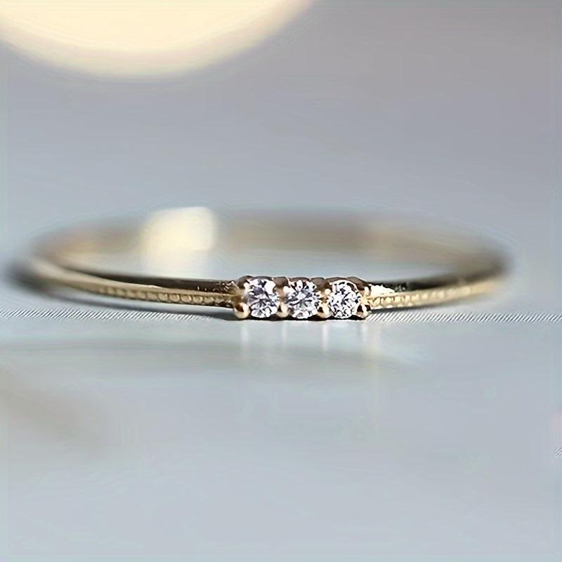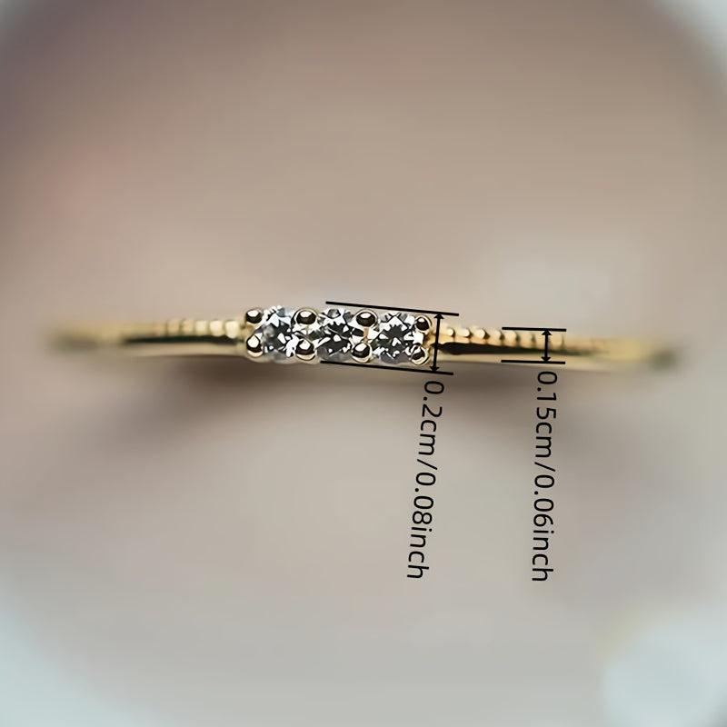 Add a touch of elegance to your look with this stunning ring featuring three synthetic zirconia stones. The thin band design makes it ideal for stacking or wearing on its own. Perfect for daily casual wear or special occasions.