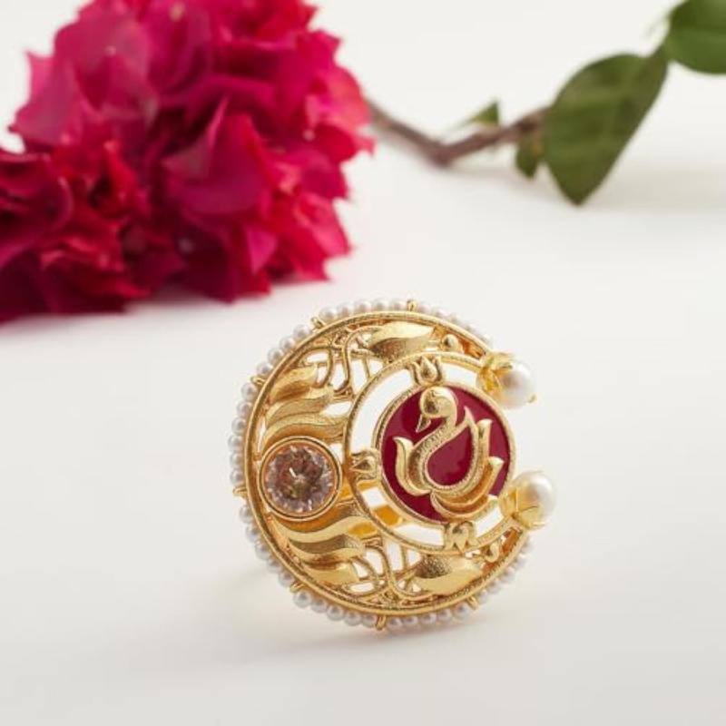 Add a touch of elegance to your outfit with this filigree toned brass ring featuring faux pearls.