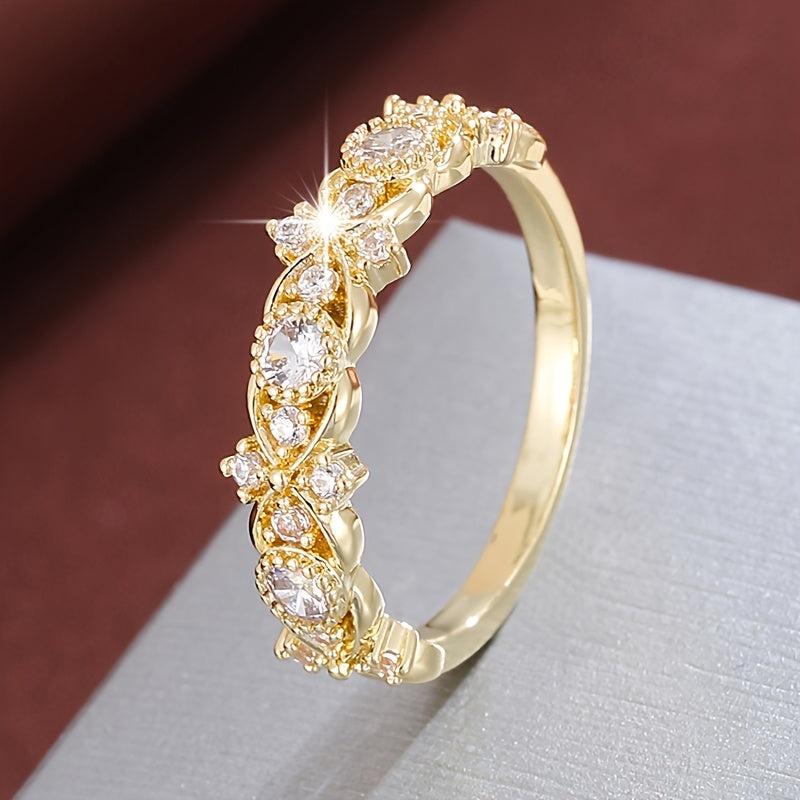 Elevate your casual attire with this stunning golden plated ring featuring a dazzling oval cut synthetic zirconia stone surrounded by floral geometric design. Perfect as a gift for a loved one.