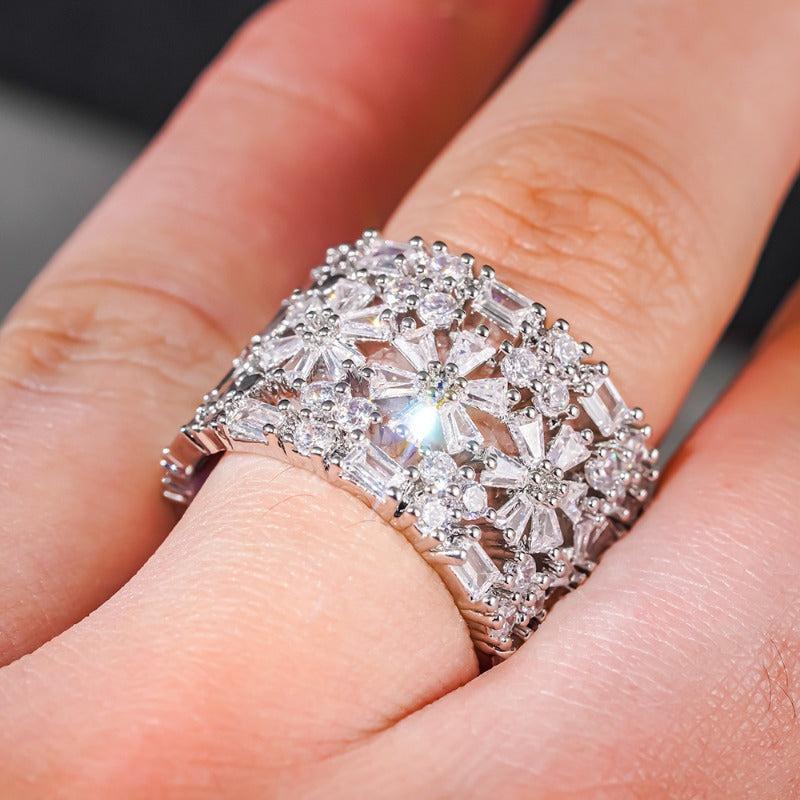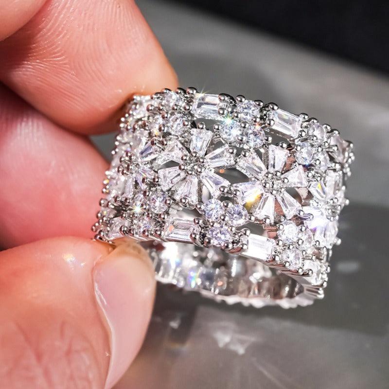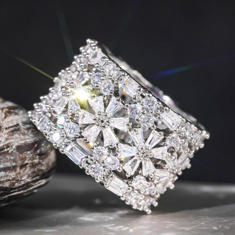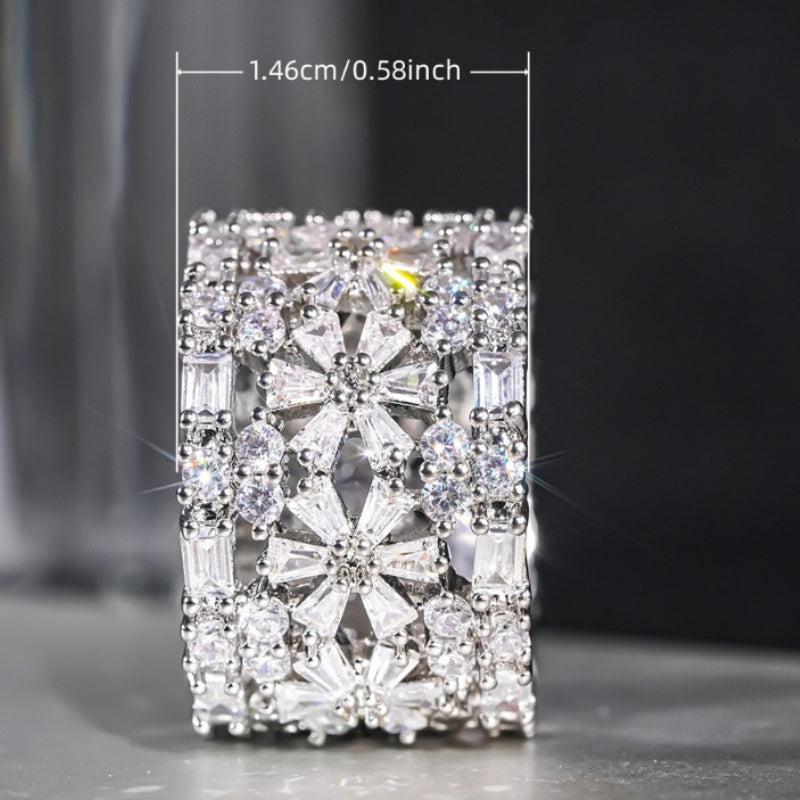 This stunning wide band ring features a floral hollow design with sparkling synthetic zirconia stones. Perfect for weddings, banquets, parties, or as a gift for women born in April.