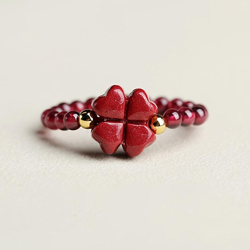 This lucky clover ring features garnet beads and a stretchy braided design, perfect for casual wear. An ideal Valentine's Day gift.
