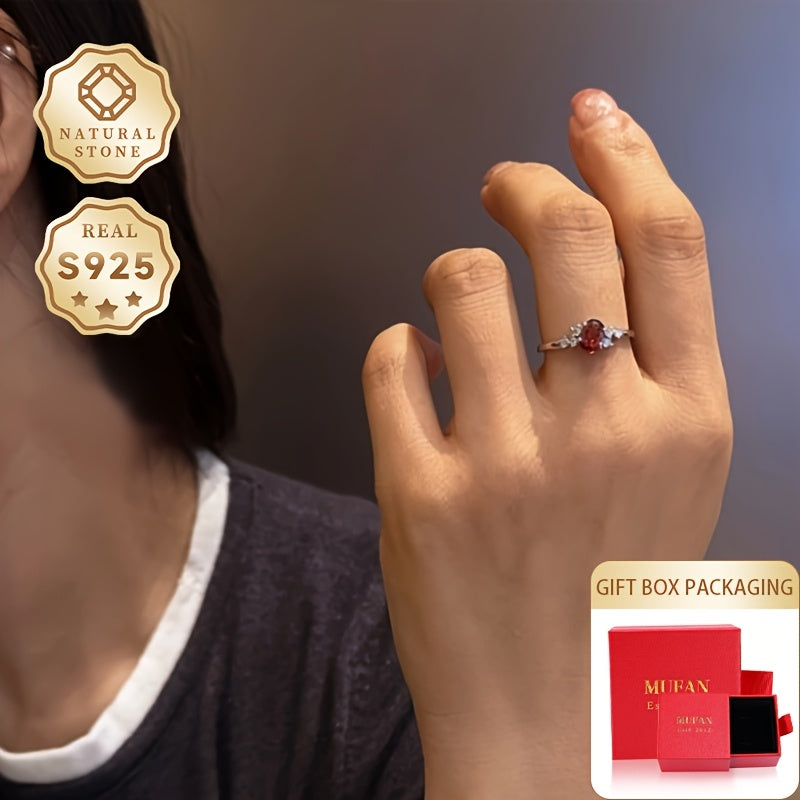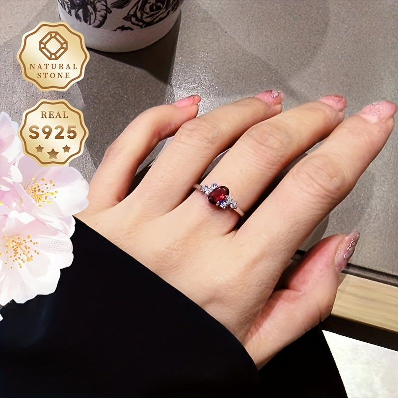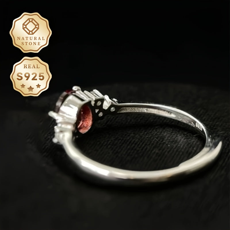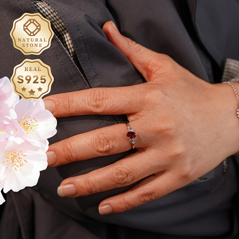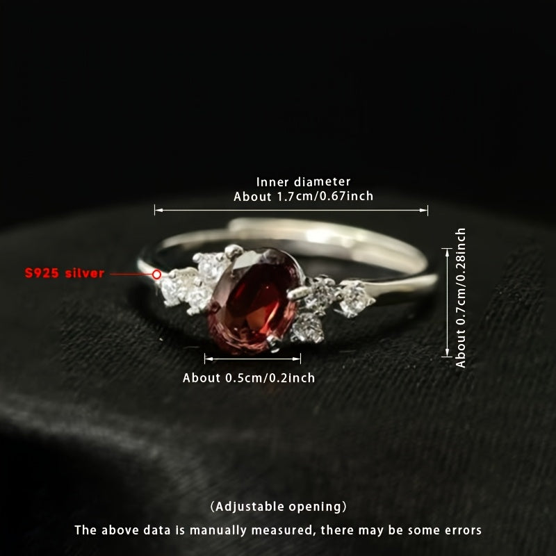 This stunning garnet ring features a natural stone about 5-7mm in size. Crafted from S925 silver, the open ring is adjustable to fit most finger sizes. Each garnet stone is unique, showcasing natural shape and differences.