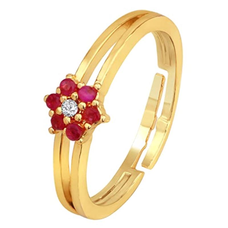 Elegant floral finger ring featuring a ruby and crystal, plated in gold.