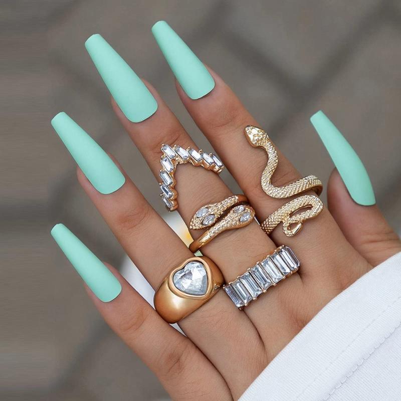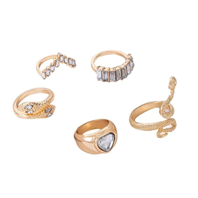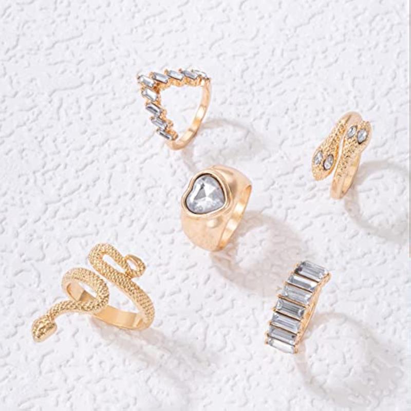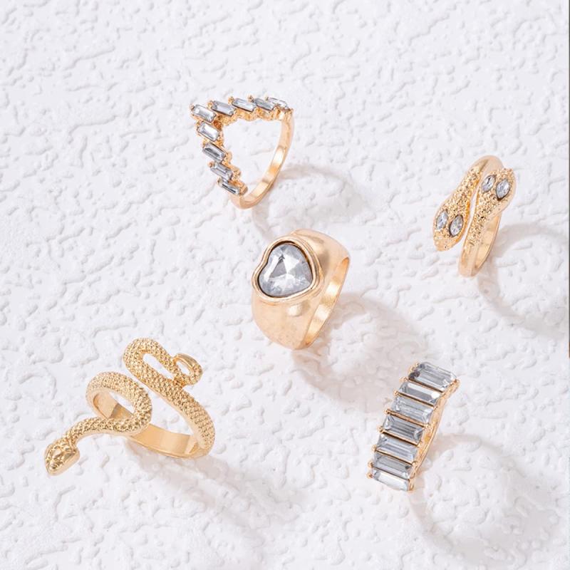 Elevate your style with this set of 5 stackable rings featuring heart-snake inspired designs. Perfect for adding a touch of elegance to any outfit.