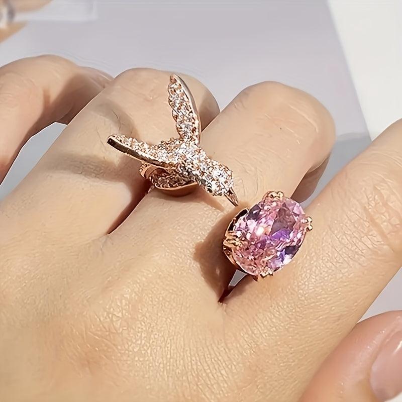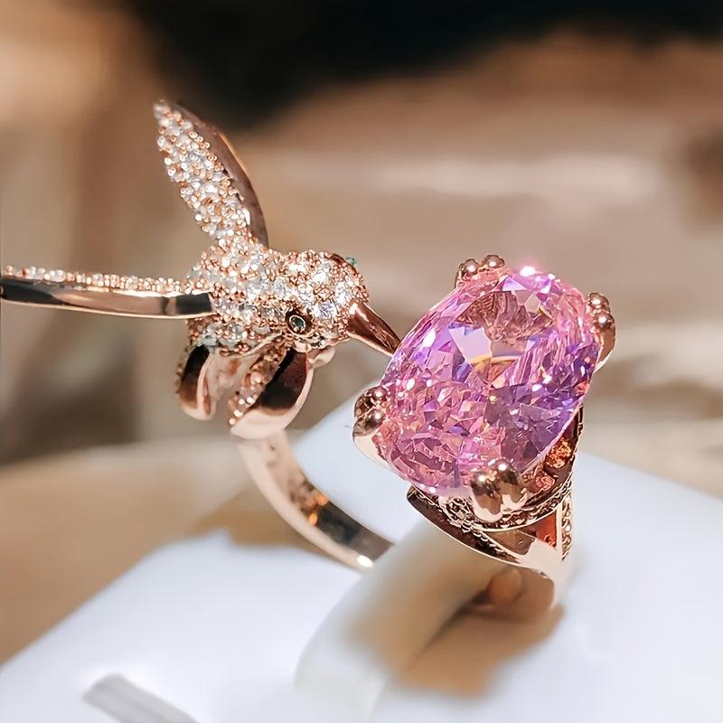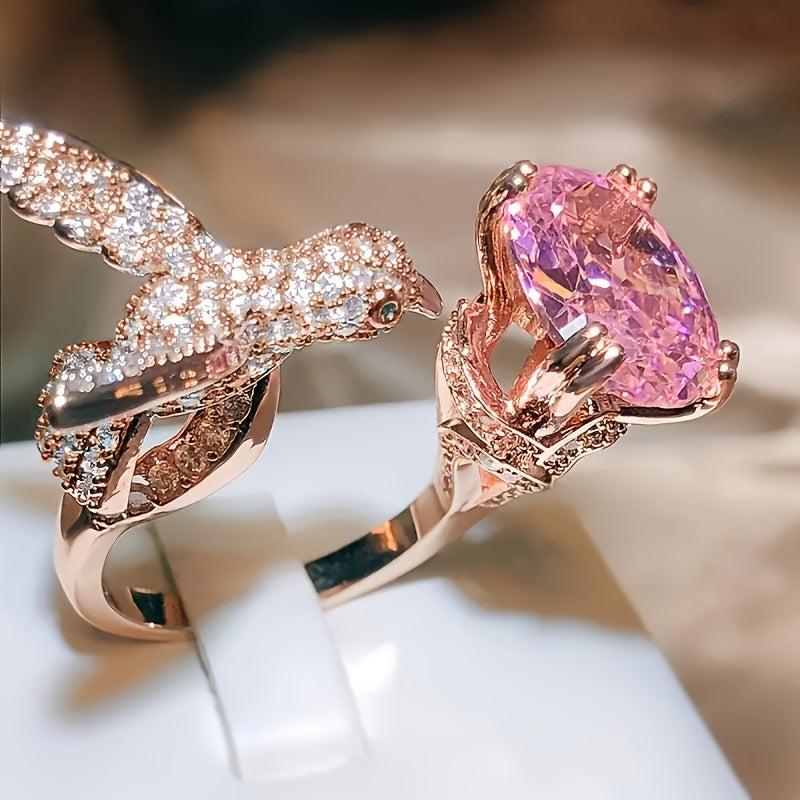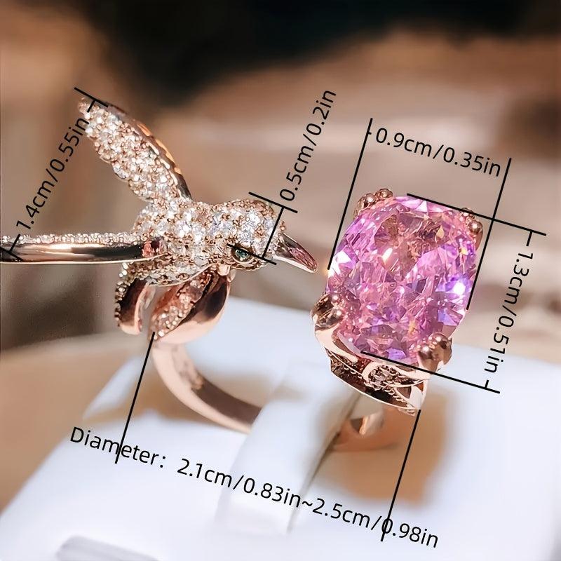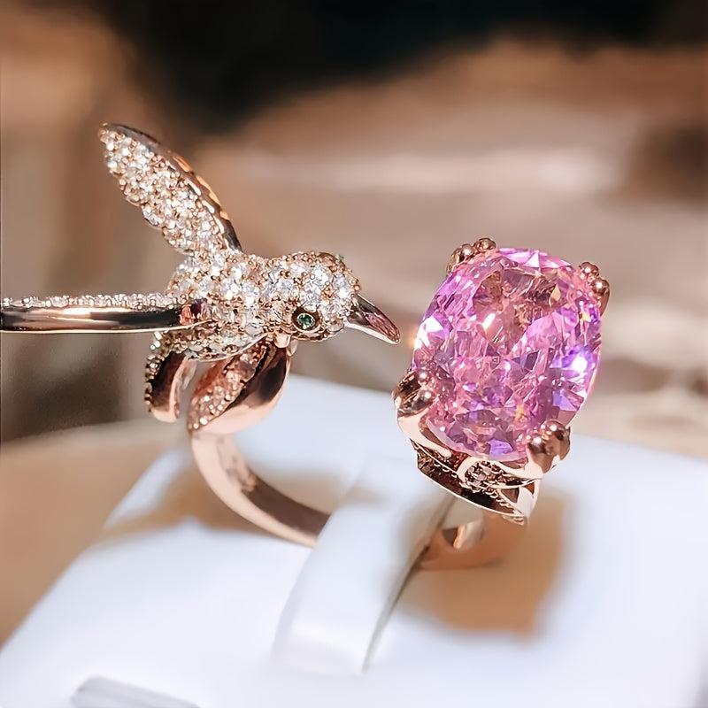 Elegant golden bird inlaid pink zirconia open ring perfect for daily wear or special occasions. Delicate accessory that adds charm. Ideal gift idea for loved ones.