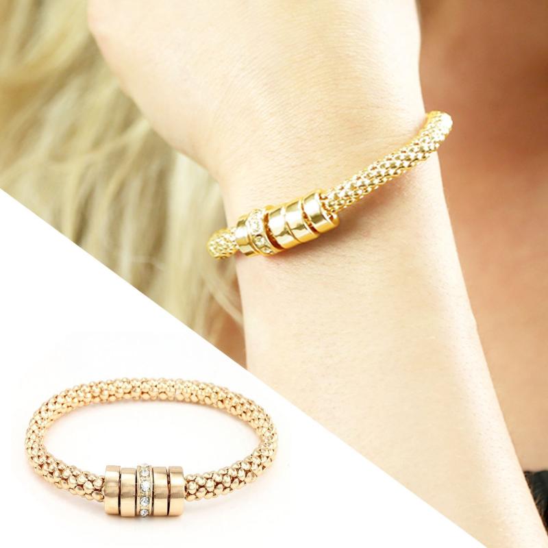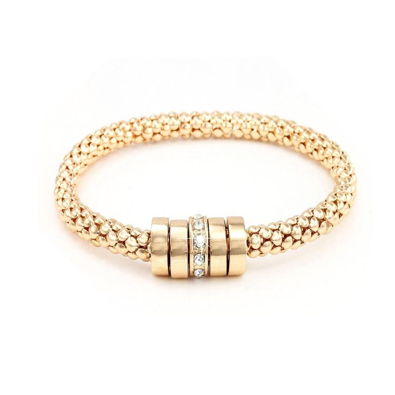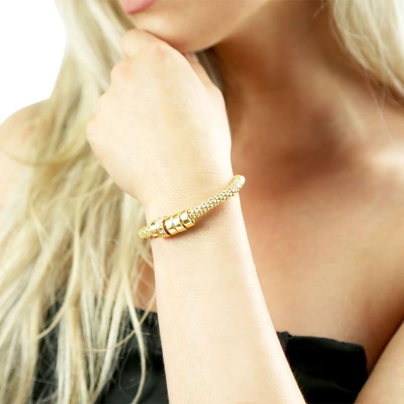 This stunning bracelet features golden hoop beads with crystal encrusted detailing. It has a stretch fit snake chain design that is perfect for women's birthdays, anniversaries, Mother's Day, and special occasions.