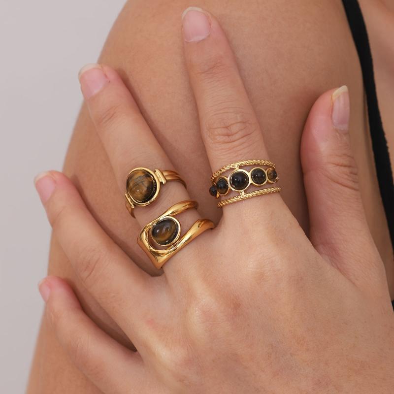 Elegant round hollow ring with an opening adjustment featuring a natural stone center. Perfect for a gift or to wear at banquets with its light design.