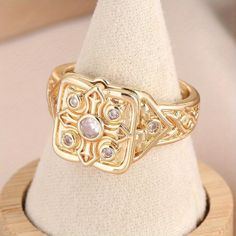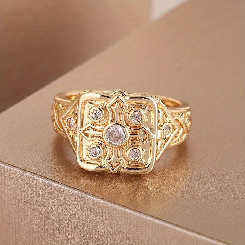 Elevate your style with this intricate square ring featuring floral carvings and geometric gemstone accents. Perfect for bohemian weddings or vacation getaways.