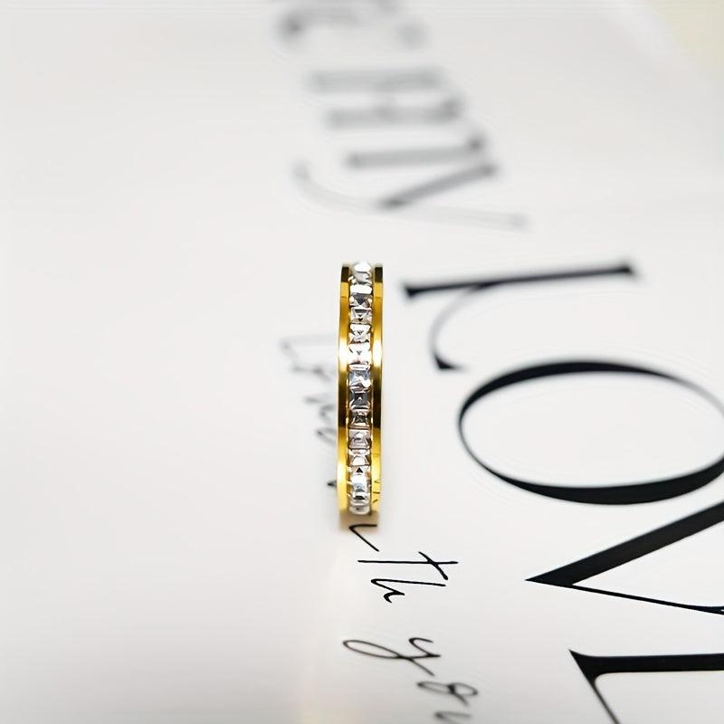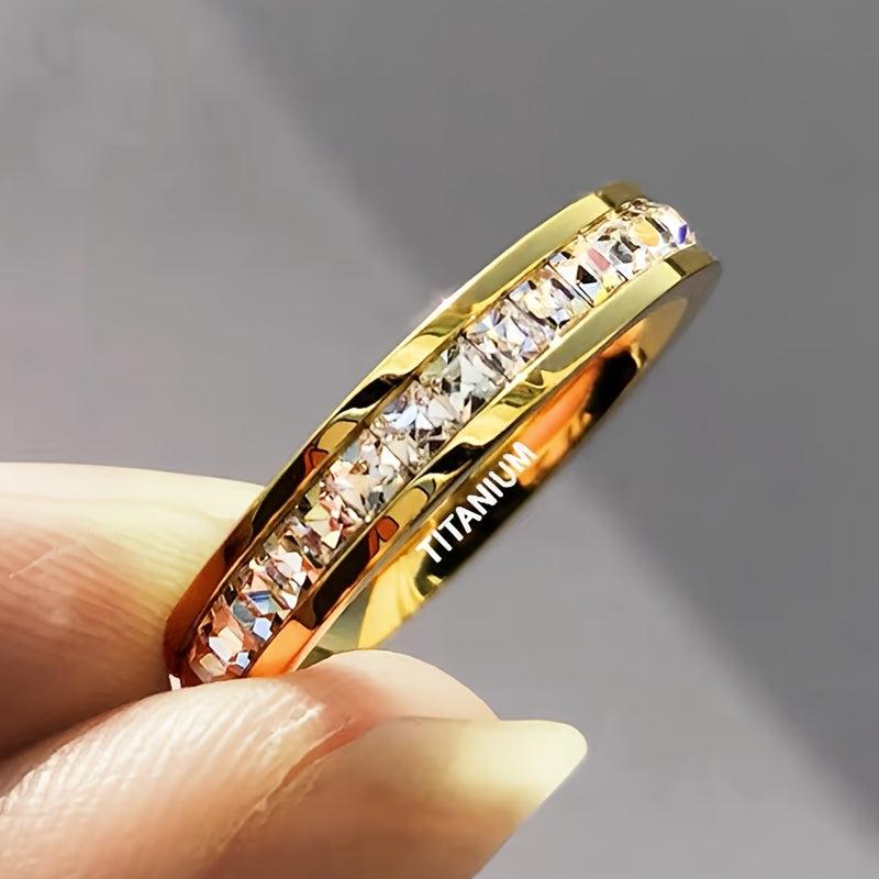 Elegant 4mm titanium steel ring featuring square cut synthetic zirconia stones, perfect for wedding anniversaries or special occasions.