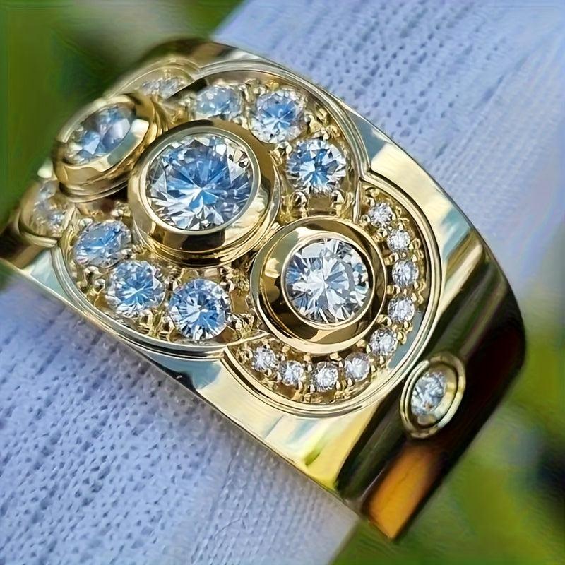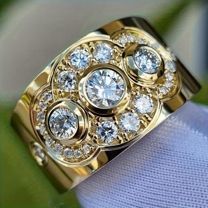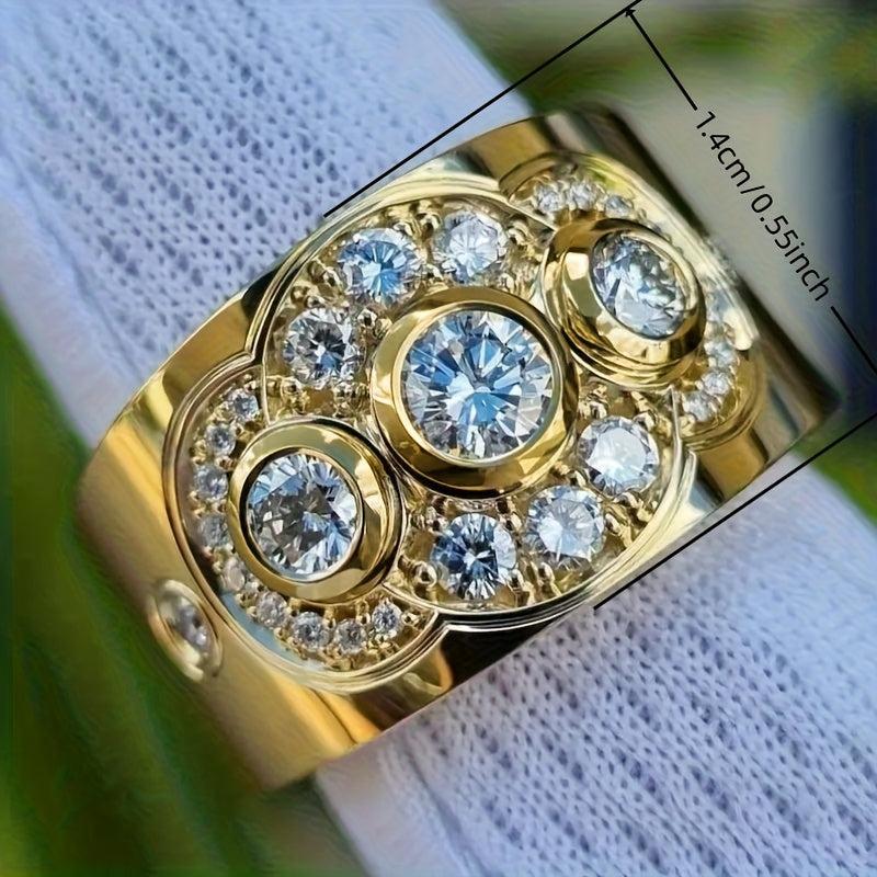 This stunning wide band ring features three synthetic zirconia stones set in a golden tone setting. Perfect for everyday wear or special occasions like parties, weddings, or anniversaries.
