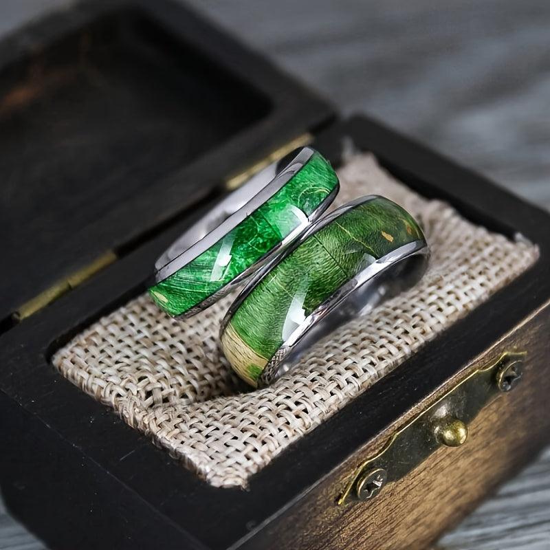 This wooden ring features a unique green color with silver-toned accents, perfect for a men's wedding band. Made from high-quality wood, this ring is durable and stylish.
