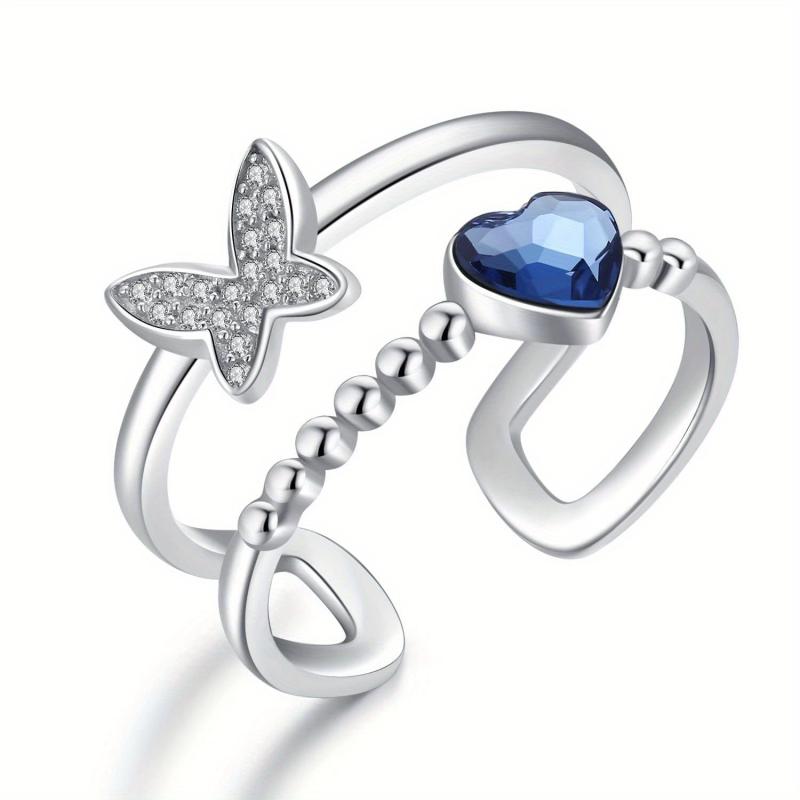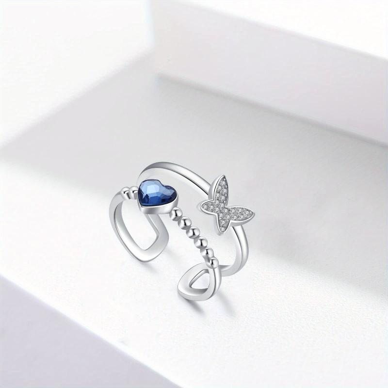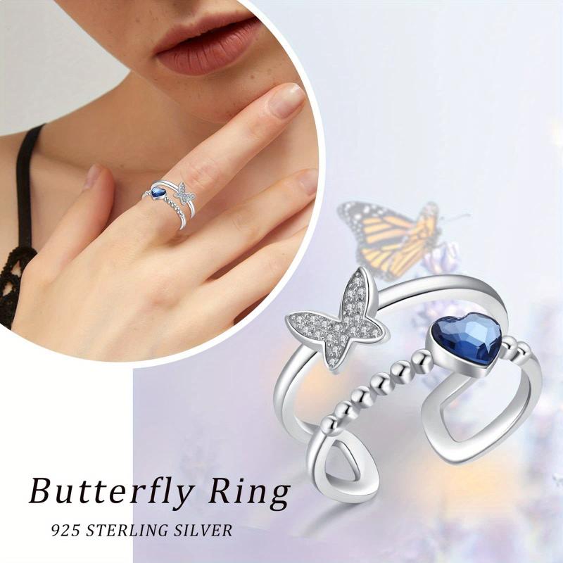 This stunning butterfly ring is made of 925 sterling silver and features a heart-shaped crystal. Perfect for women, mums, and daughters. Adjustable to fit any finger size.