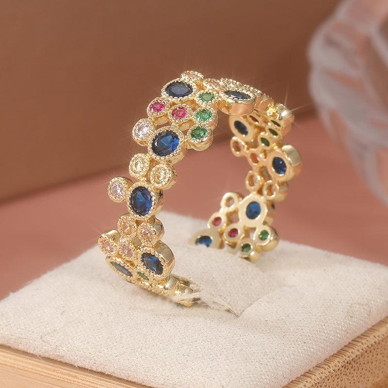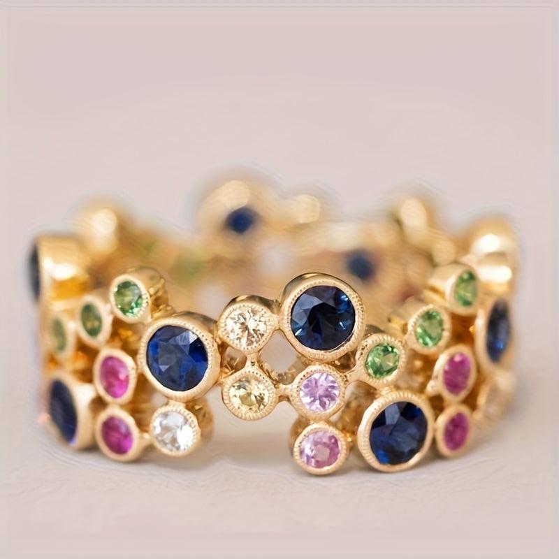 Elegant golden tone ring featuring irregular colored layered dots, perfect for engagement, wedding, or everyday wear. Crafted with heart-shaped artificial multicolor zircon for a unique look.