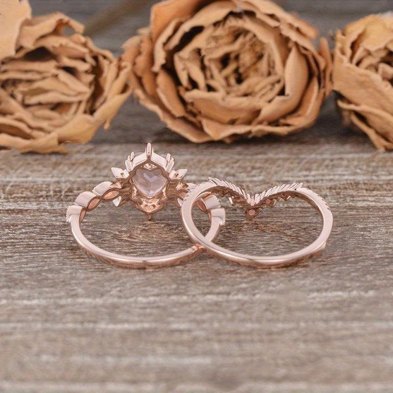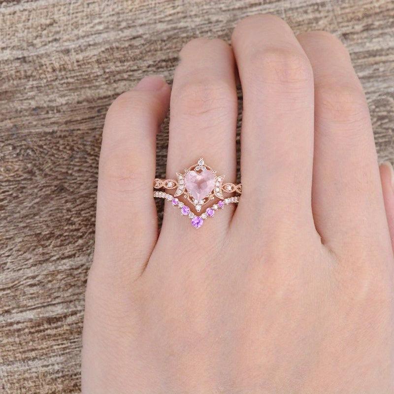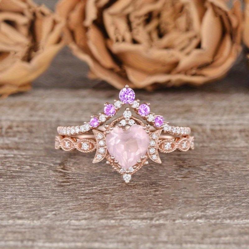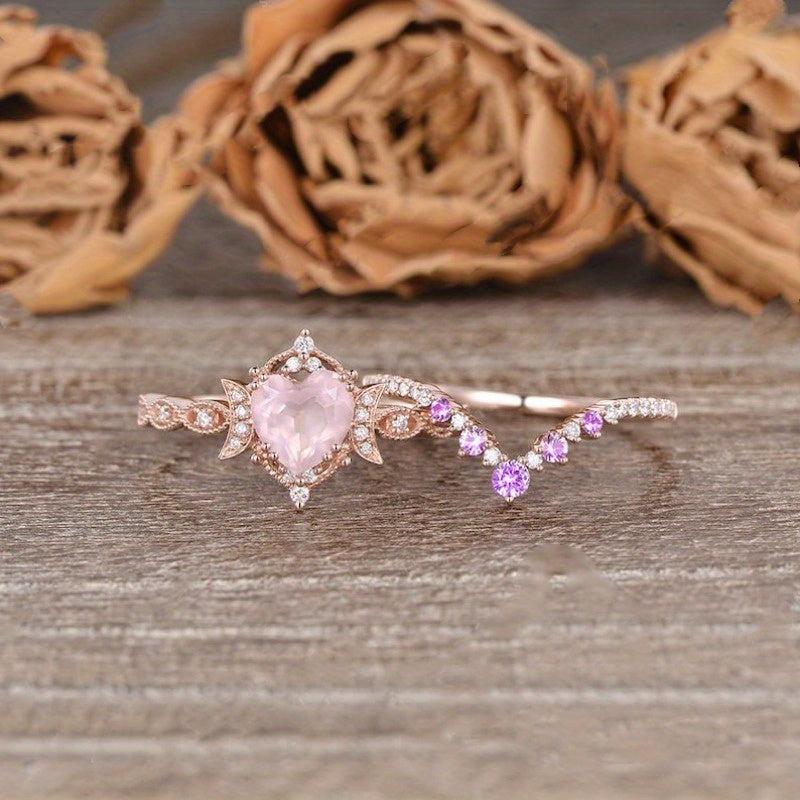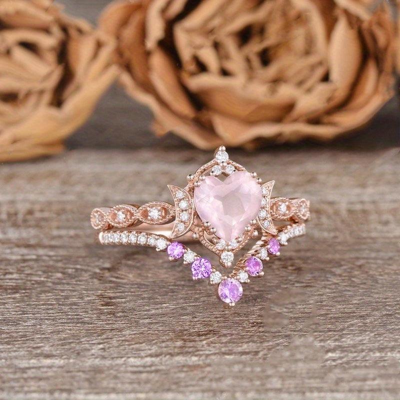 This stunning engagement ring set features a heart-shaped rose quartz center stone with synthetic zirconia accents. Perfect for a vintage-inspired bridal look, this set is ideal for an April birthstone gift or a Valentine's Day present.