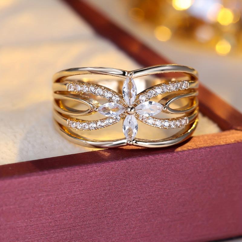 This women's ring features a unique hollowed-out windmill design crafted from copper and embellished with synthetic zirconia. It is an all-season accessory suitable for various occasions.