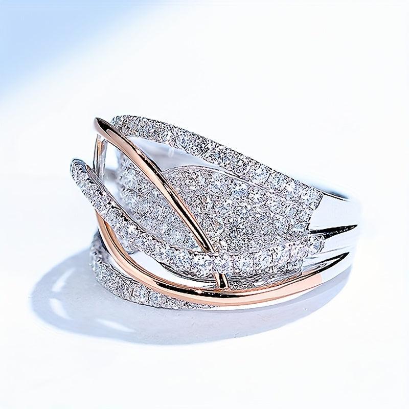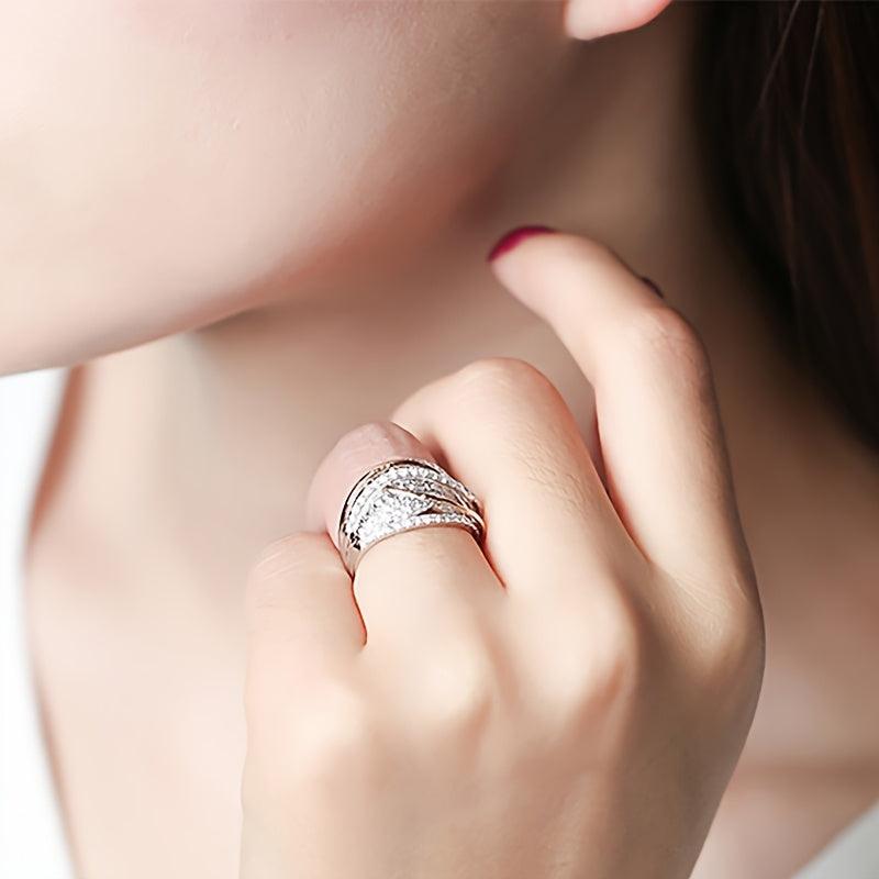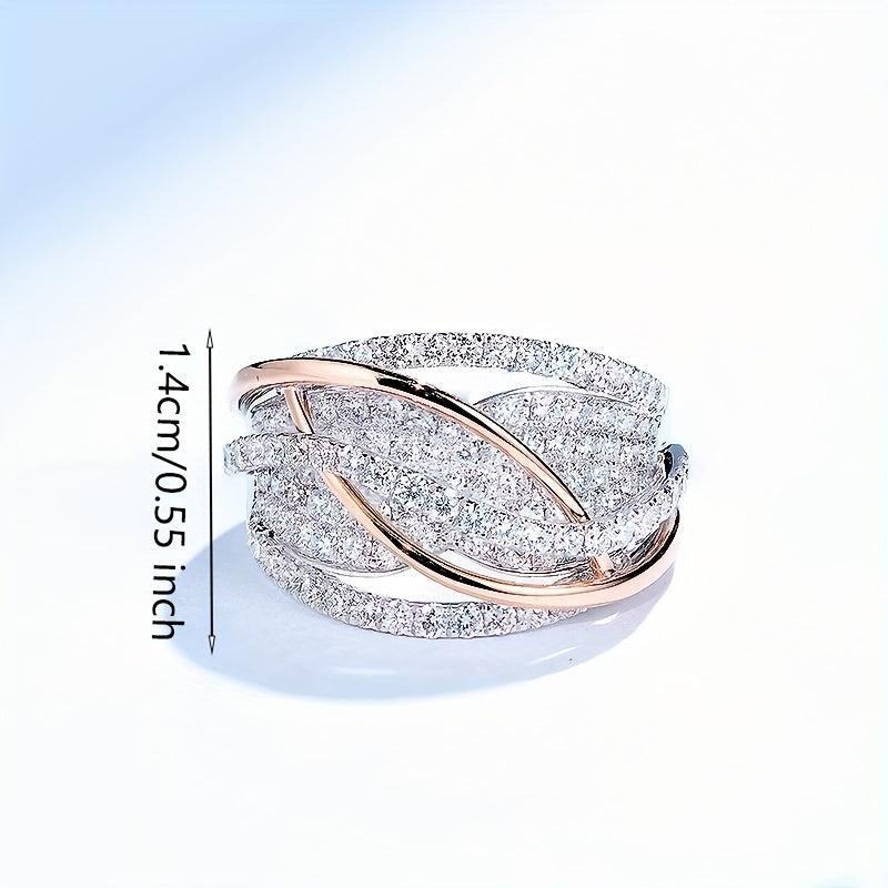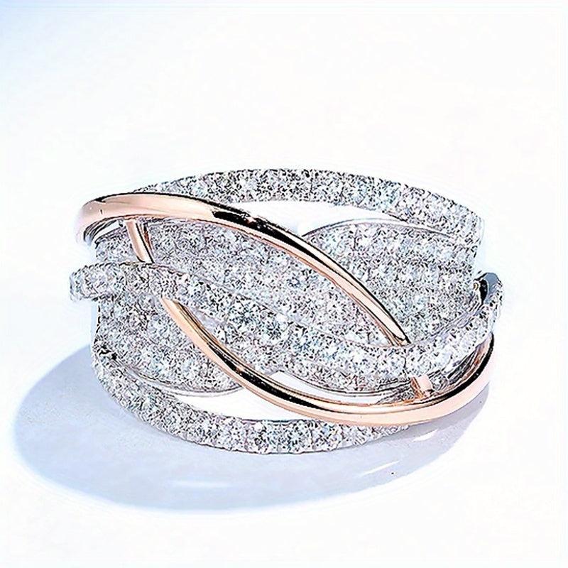 Elegant wide band ring featuring synthetic zirconia stones in a two-tone layered design. Perfect romantic proposal gift for a wedding or special occasion.
