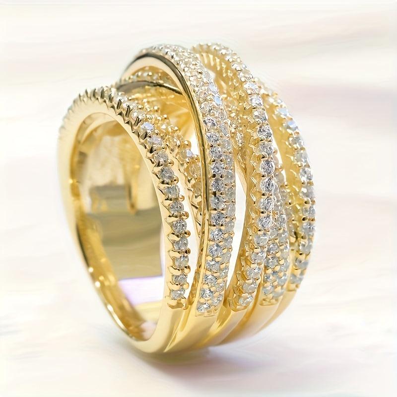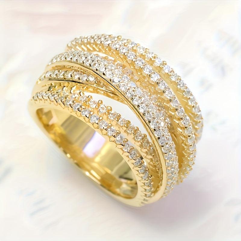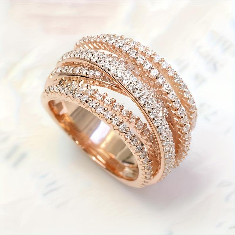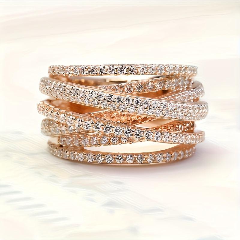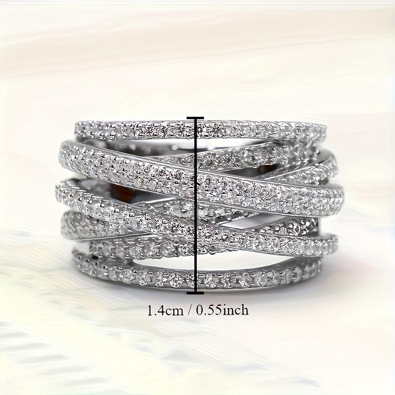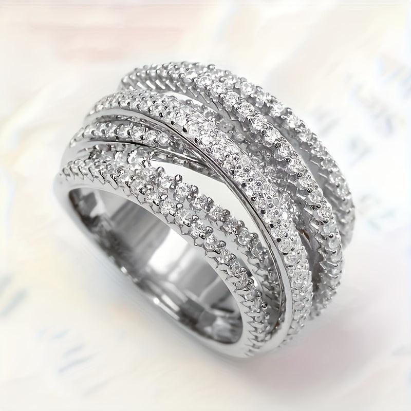 Elegant and stylish ring with intricate interwoven lines and micro paved synthetic zirconia stones, perfect for weddings and parties.
