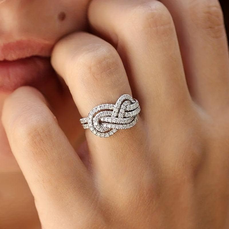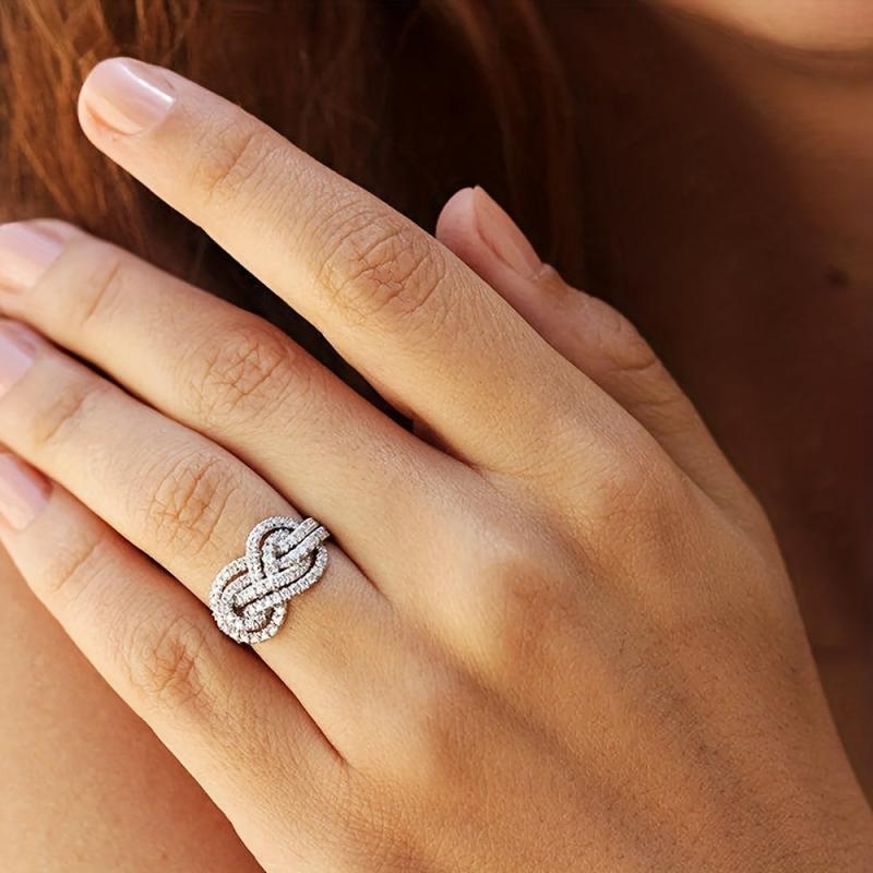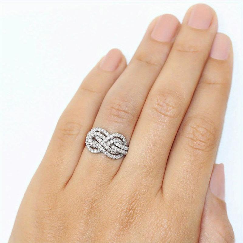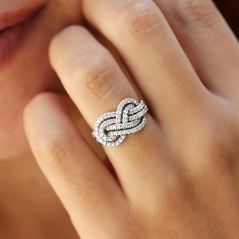 Elegant ring featuring an intricate knot design with synthetic cubic zirconia, ideal for weddings and celebrations.
