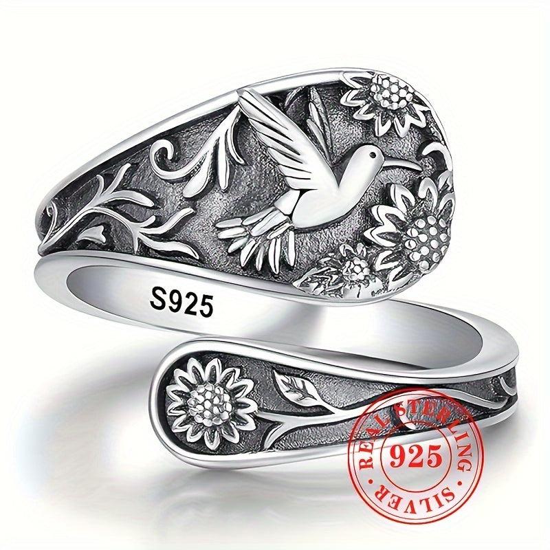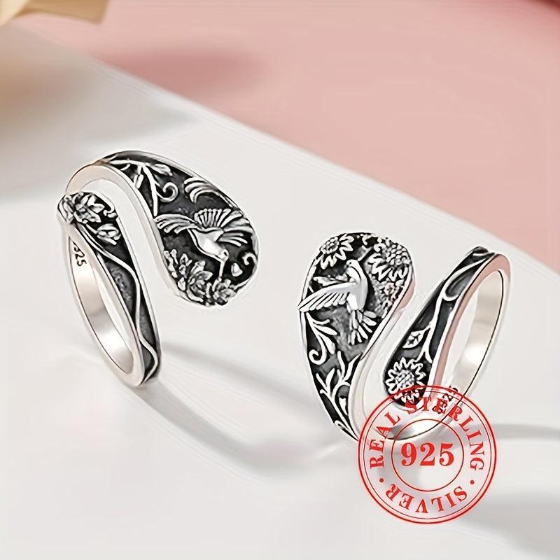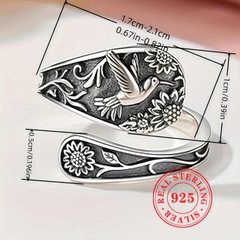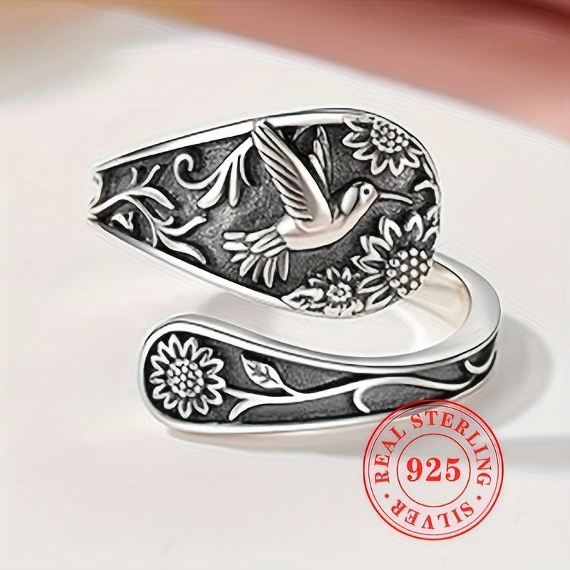 This KISS S925 ring features a bohemian design with leaf, flower, and bird carvings. It is made of pure silvery material and is adjustable for a perfect fit. Ideal for daily wear and as a gift for women.