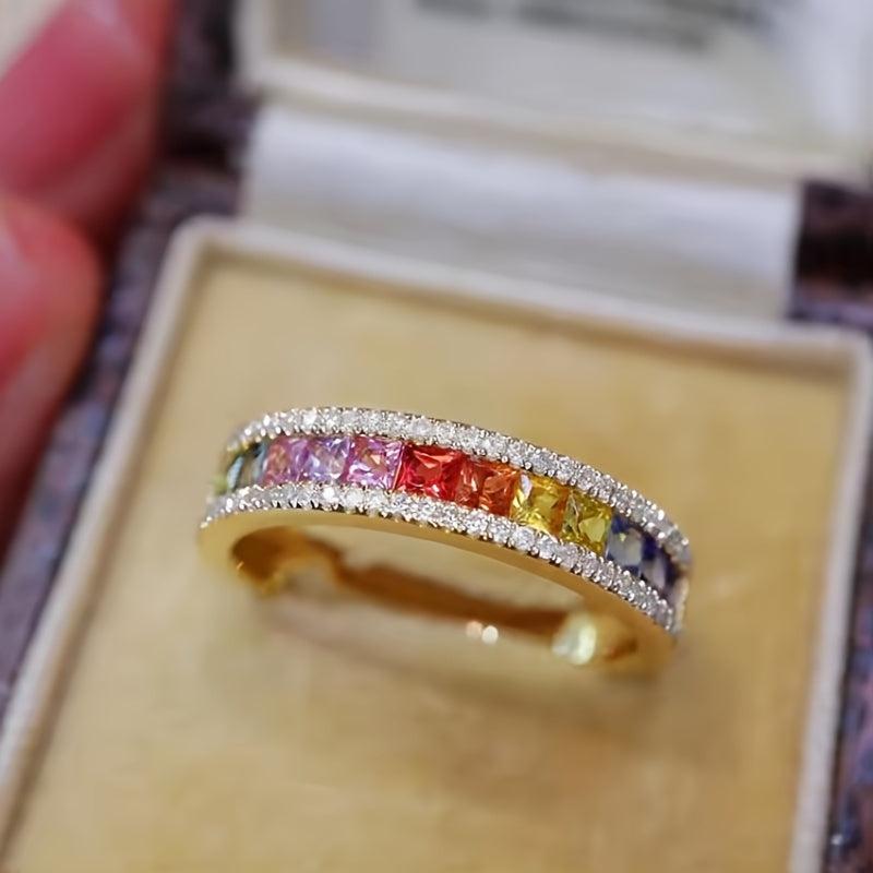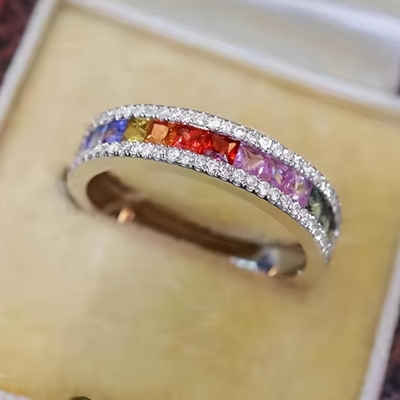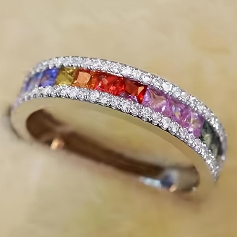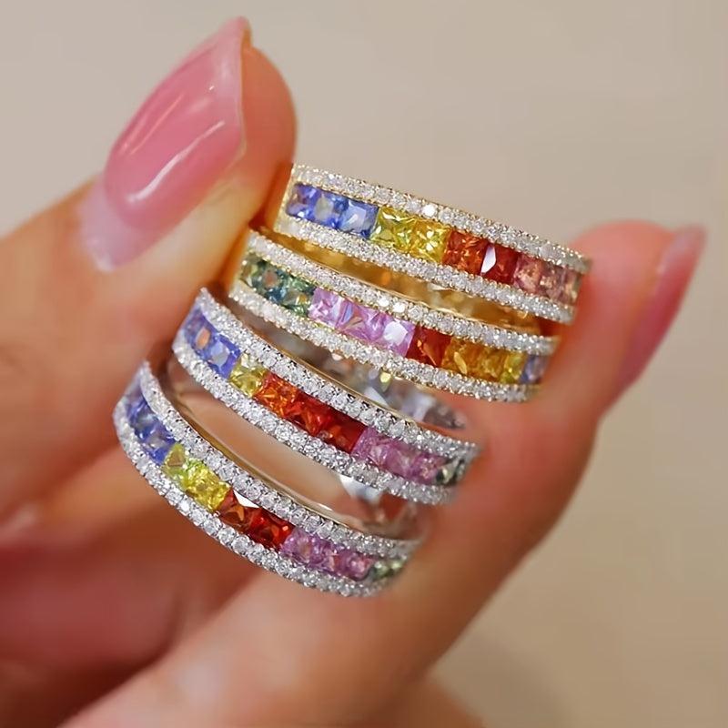 Elevate your style with this stunning rainbow-colored zirconia three stone ring. The classic design and golden plating make it perfect for everyday wear or special occasions. An ideal gift for anyone who loves minimalist and versatile jewelry.