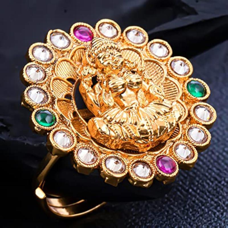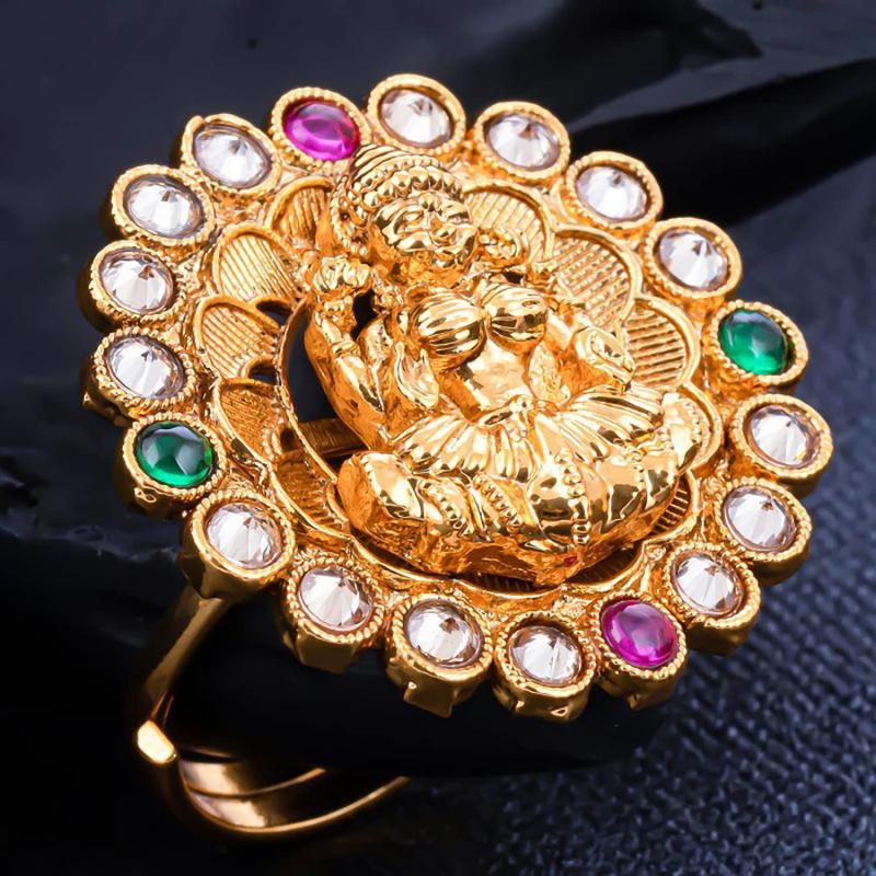 Beautifully crafted Lord Laxmi Temple Adjustable Ring with a colourful stone setting, ideal for showcasing your faith and style.