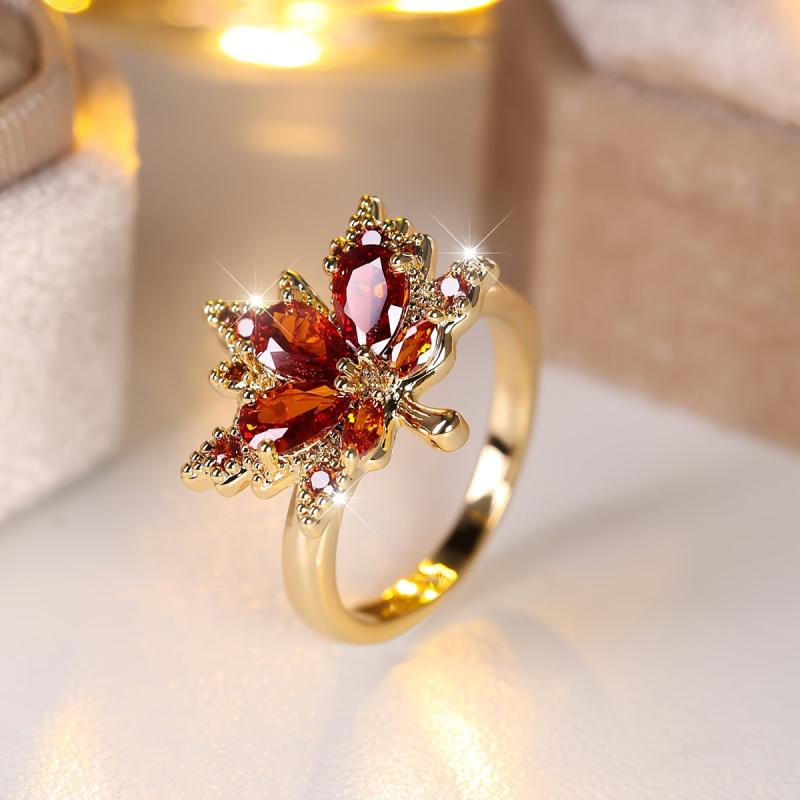 This stunning synthetic zirconia maple leaf ring is a perfect accessory for engagements, weddings, or special events. The copper band is adorned with sparkling stones, adding a touch of elegance to any outfit.