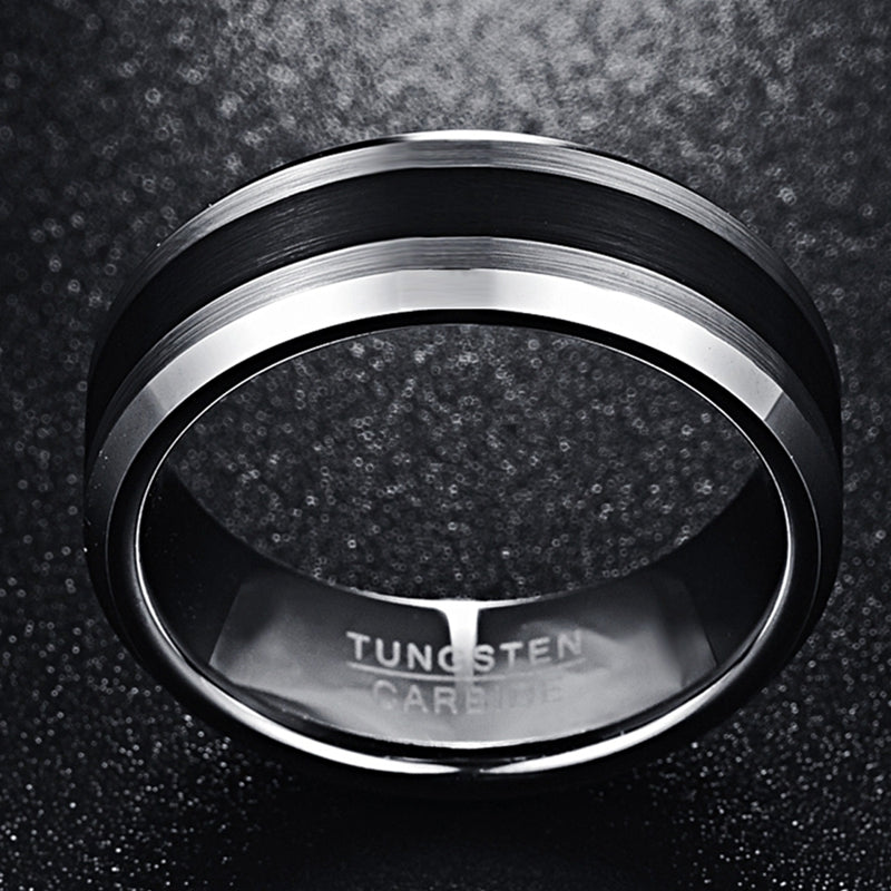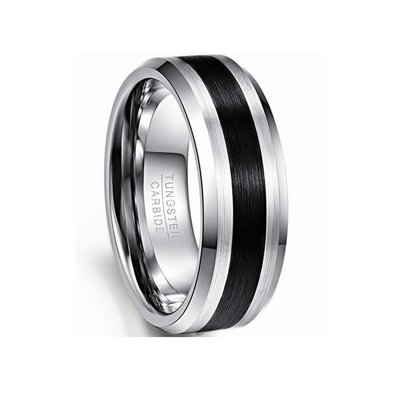This tungsten ring features a silver gray middle and a width of 8mm. Available in sizes 7 to 14.