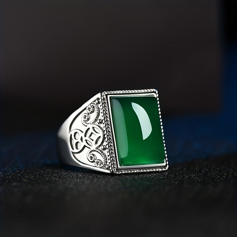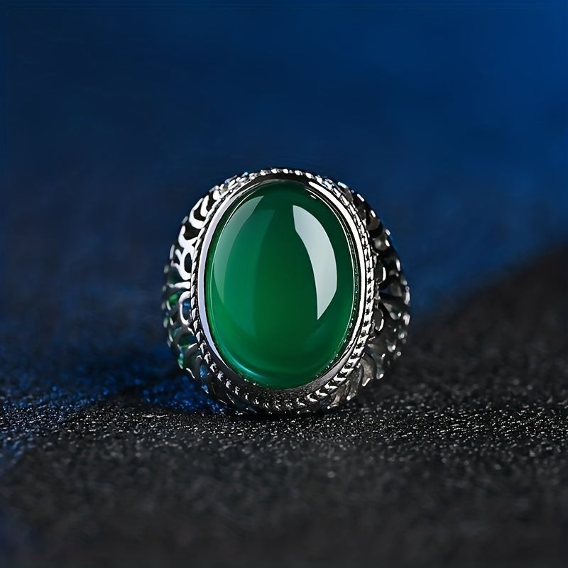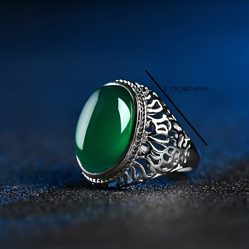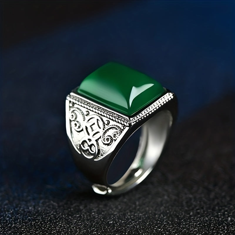 This striking men's ring features a chrysoprase gemstone set in a silver band. The ring is adjustable, making it a versatile and stylish accessory for any man.