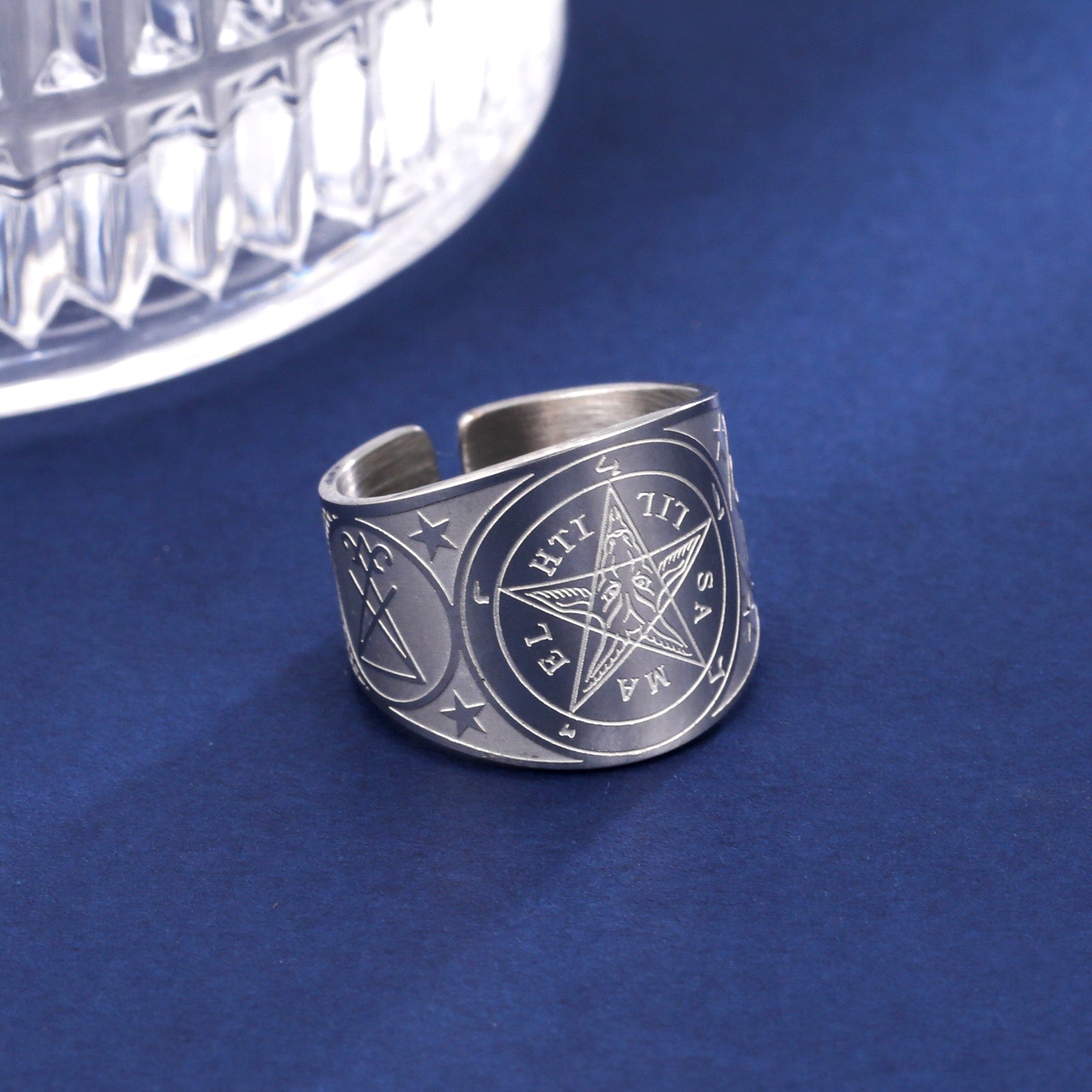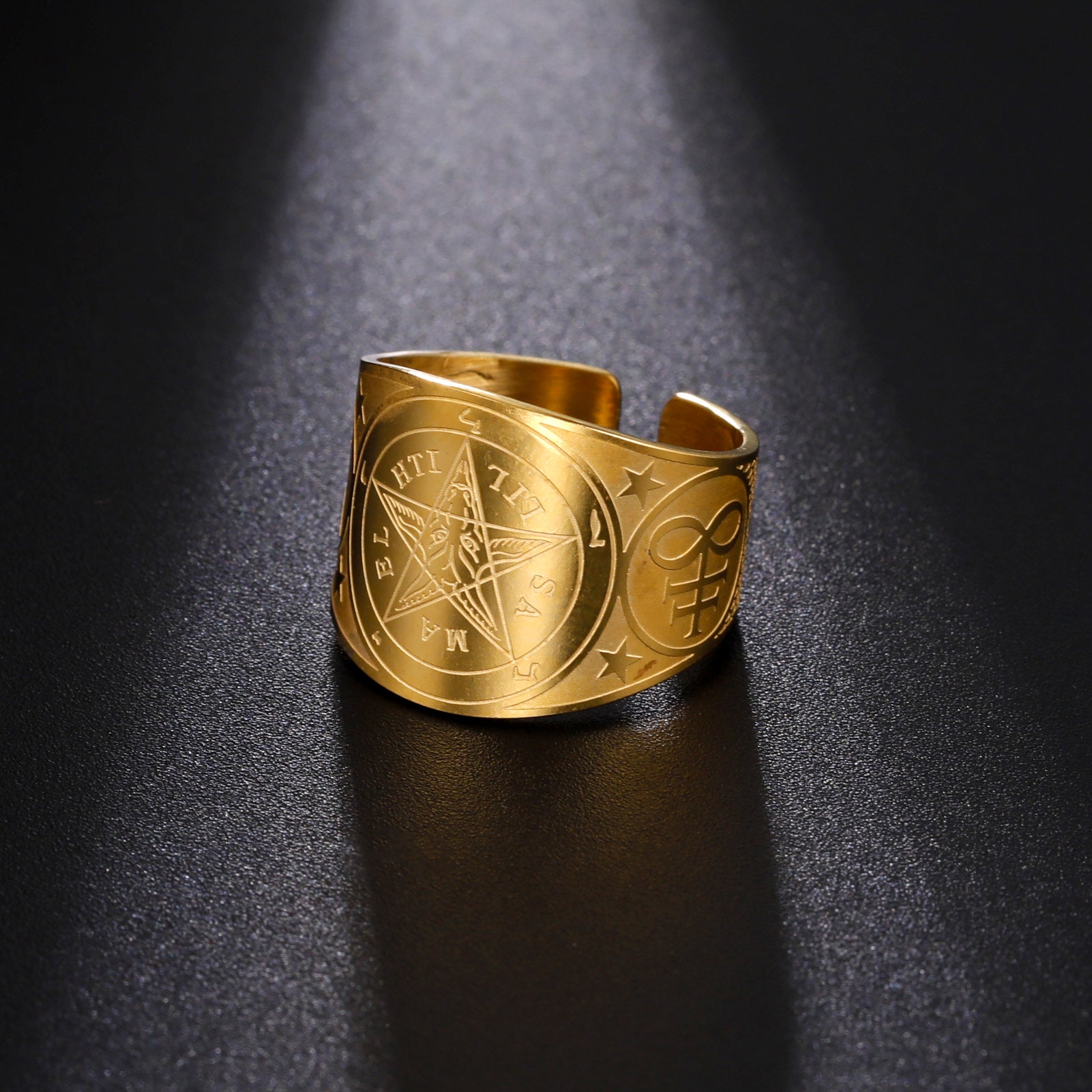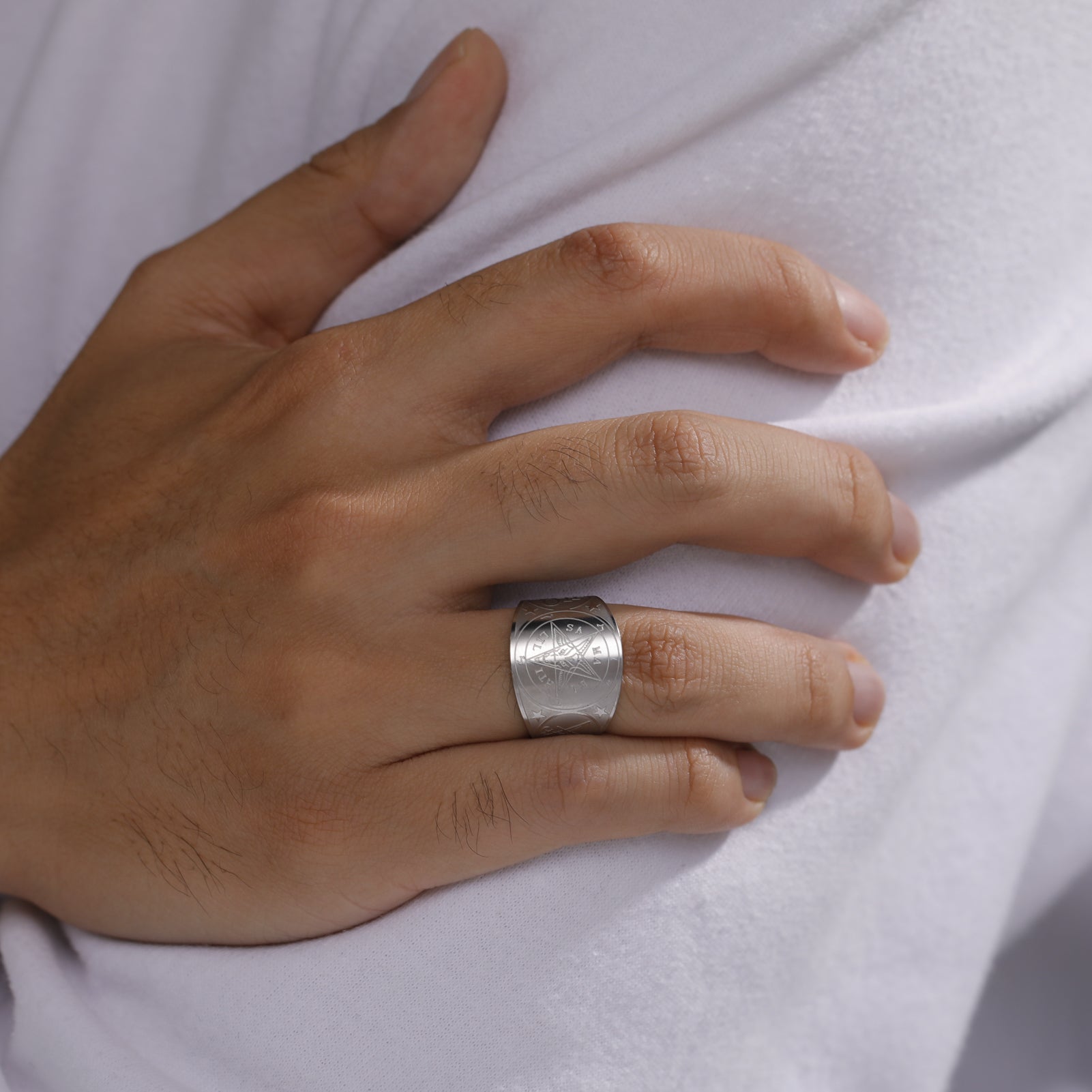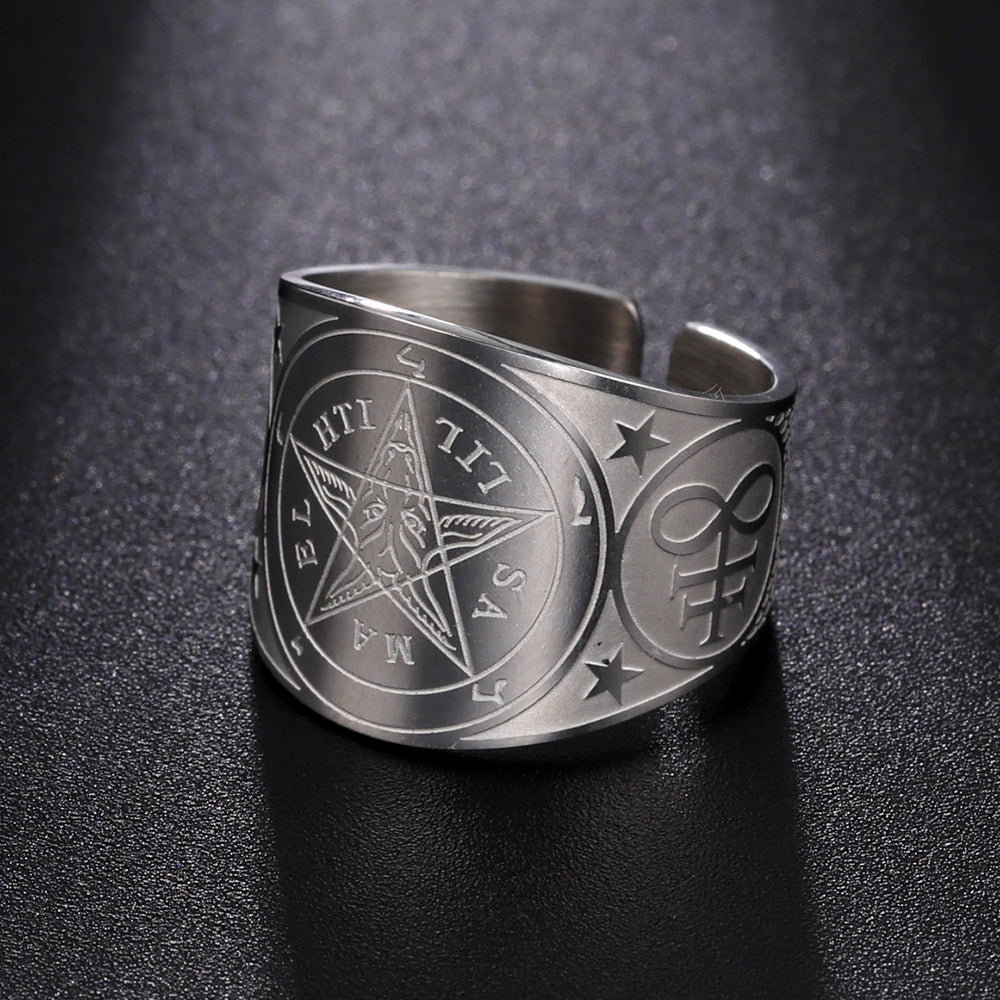 Embrace your dark side with this occult sigil pattern ring for men. Crafted in stainless steel, this stylish devil pentagram ring is a bold statement piece of jewelry.
