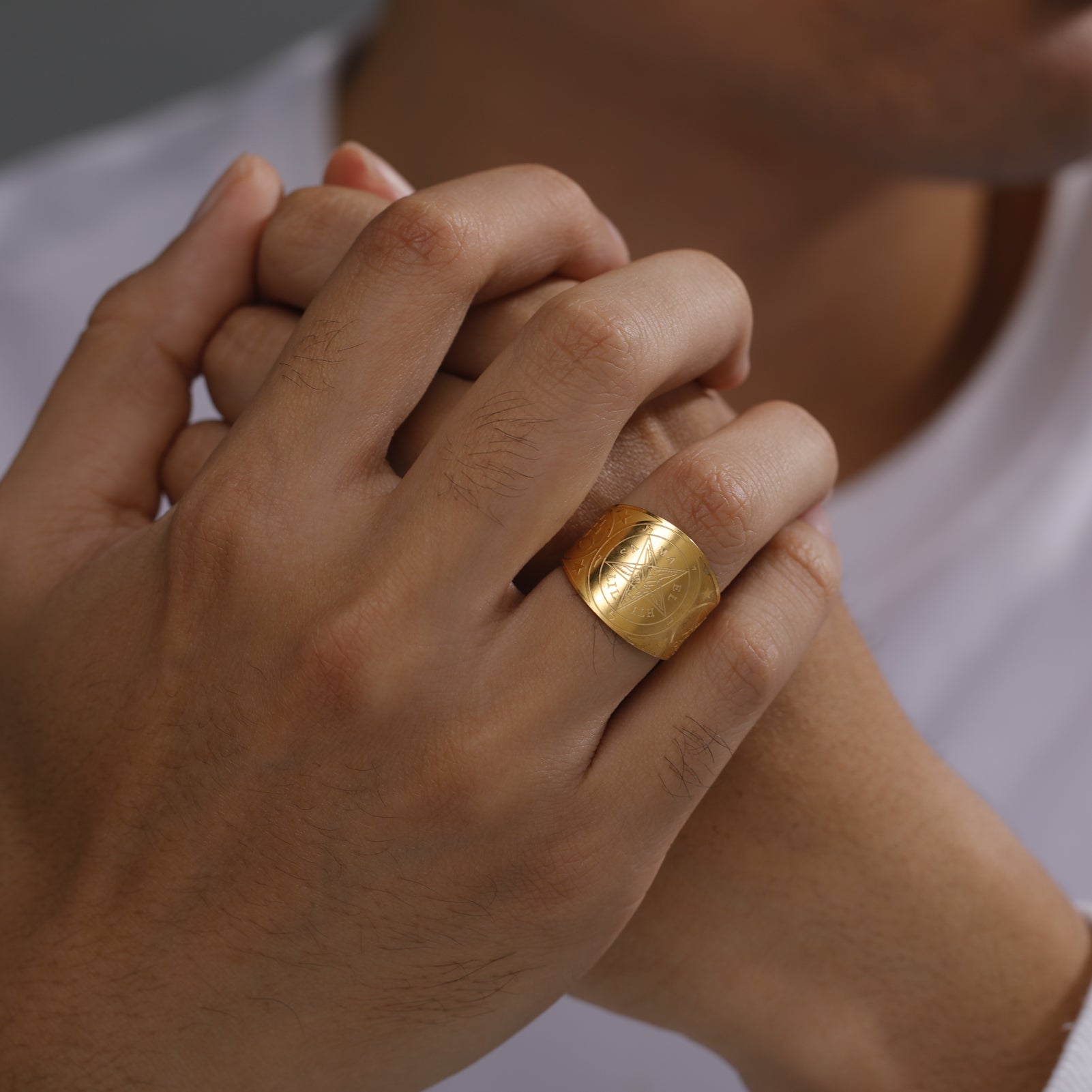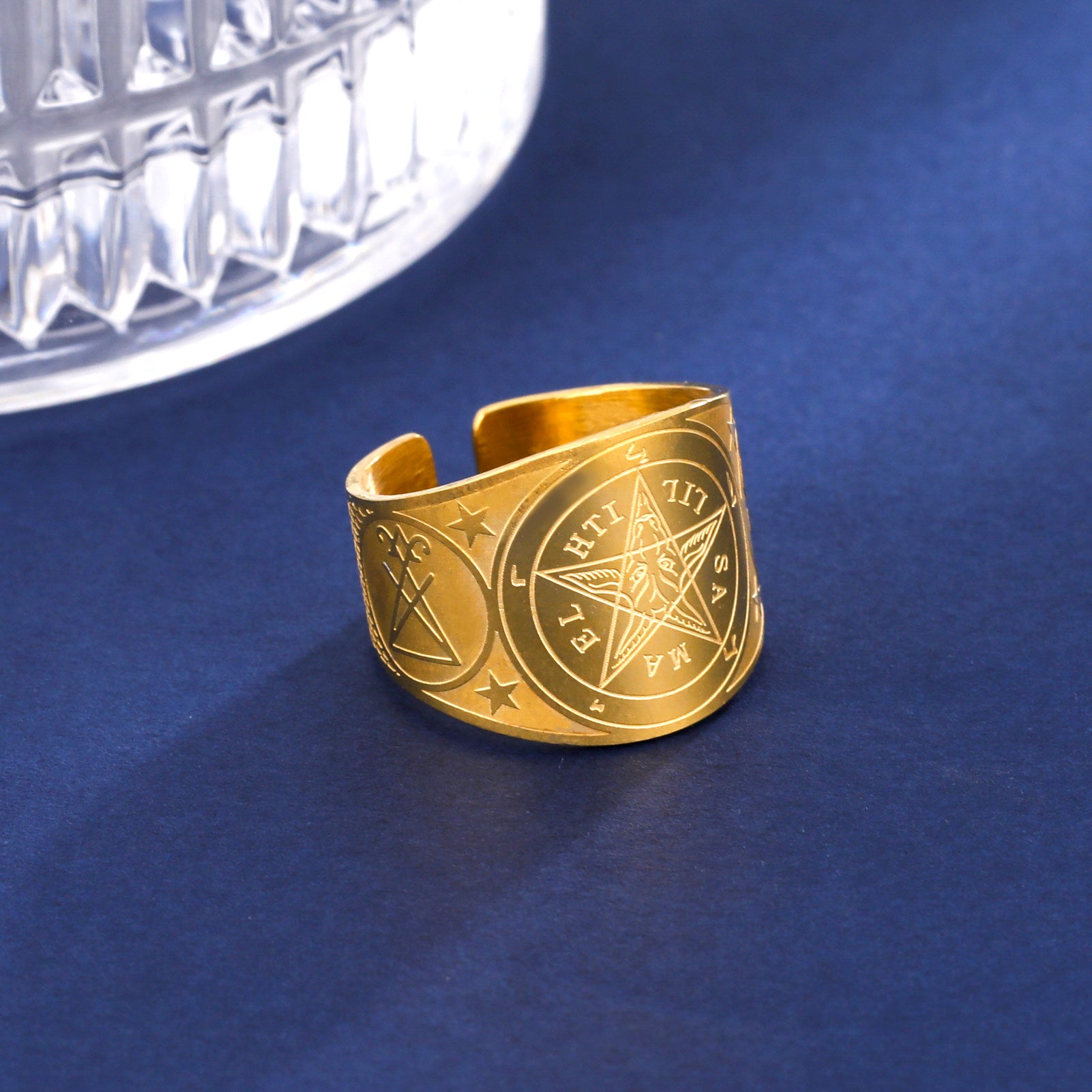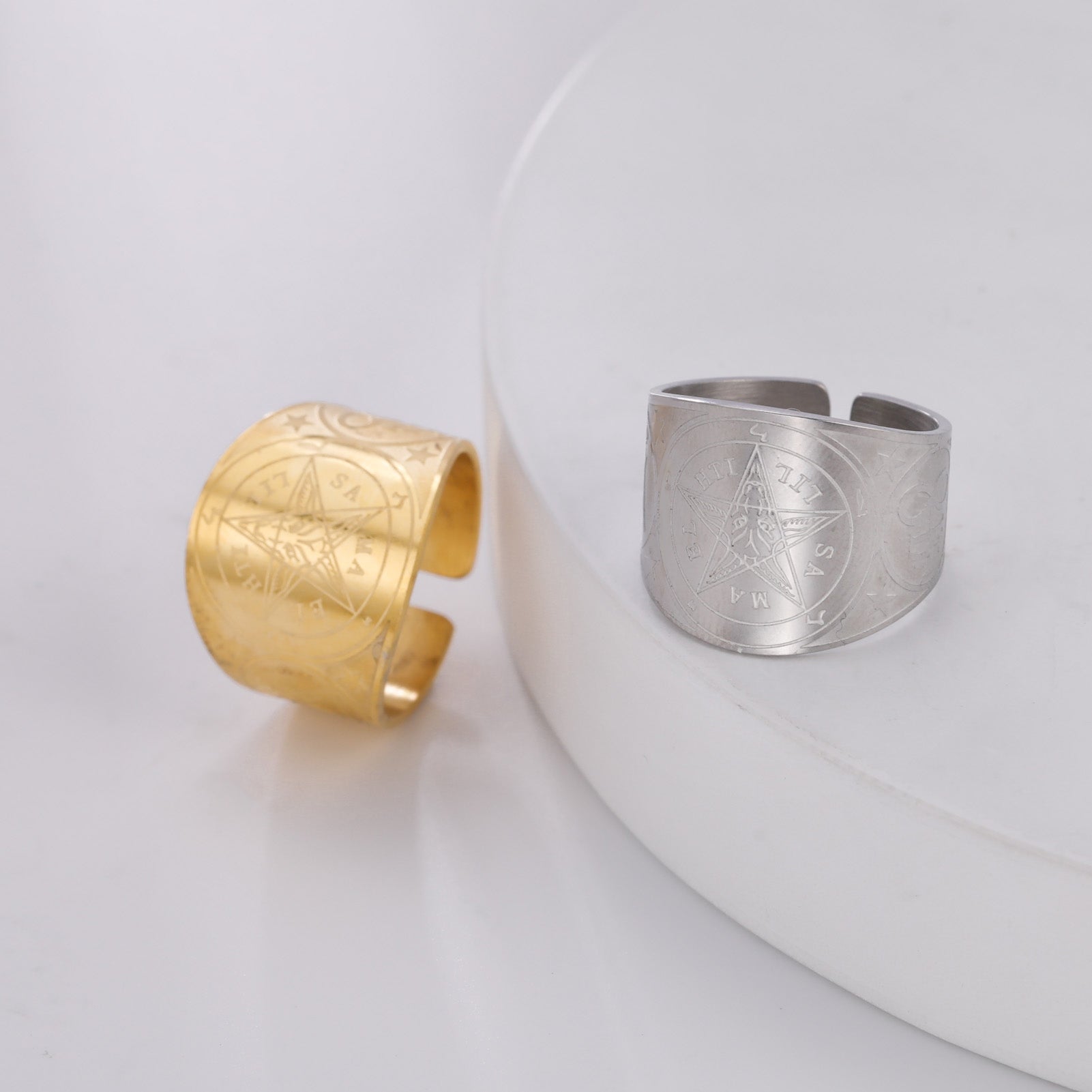 Embrace your dark side with this occult sigil pattern ring for men. Crafted in stainless steel, this stylish devil pentagram ring is a bold statement piece of jewelry.