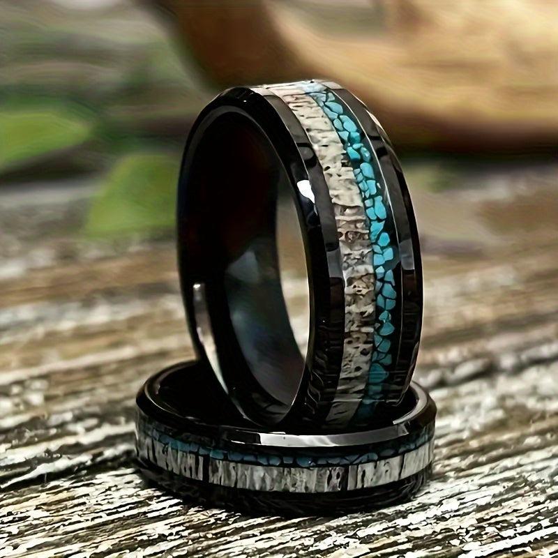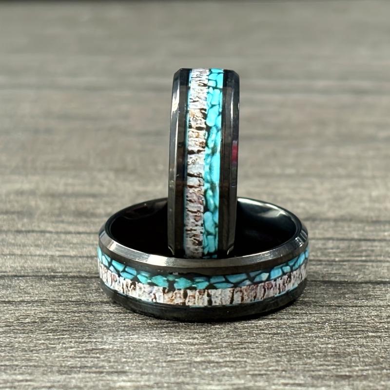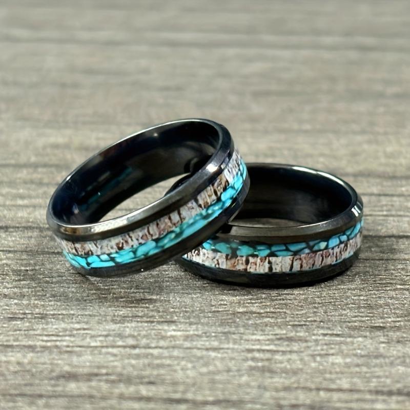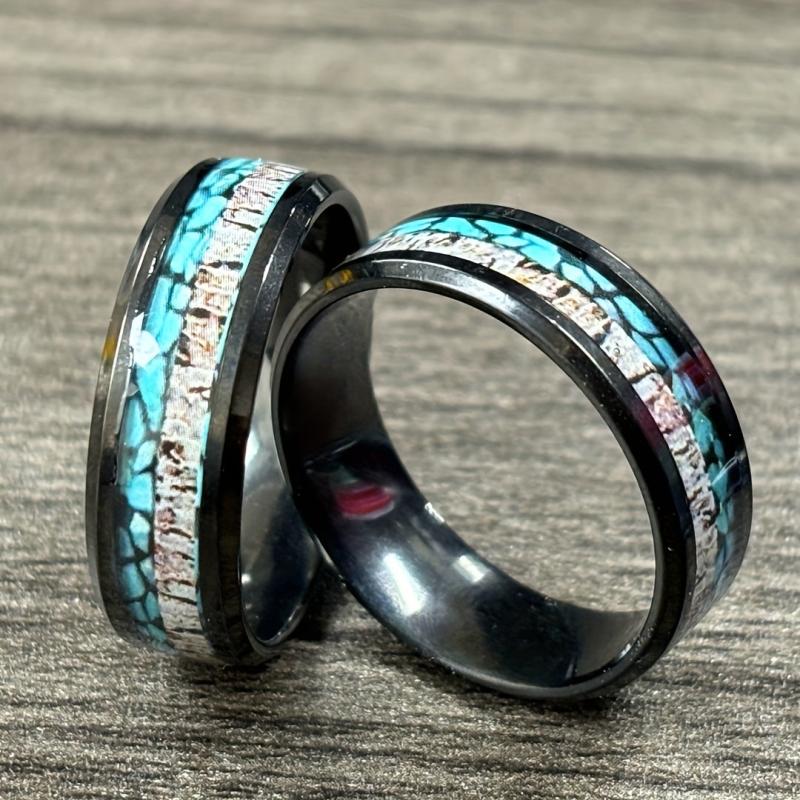 This sleek and modern ring is made of 201 stainless steel with an 8mm band featuring a turquoise wood inlay. Perfect for everyday wear or as an anniversary gift for your husband.