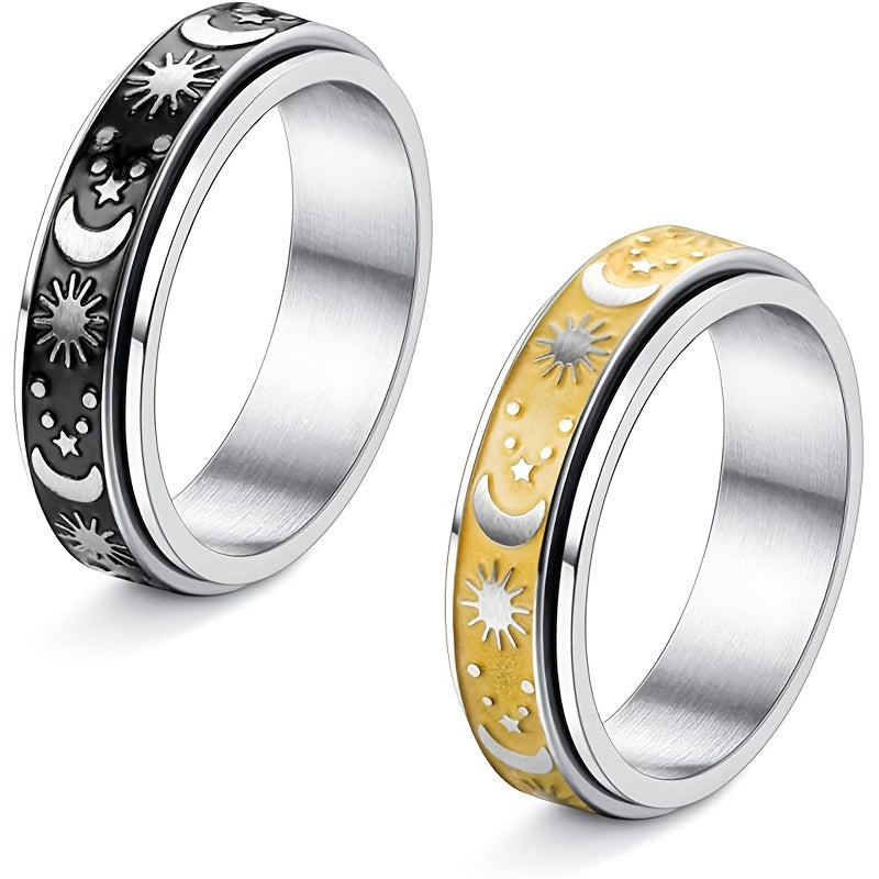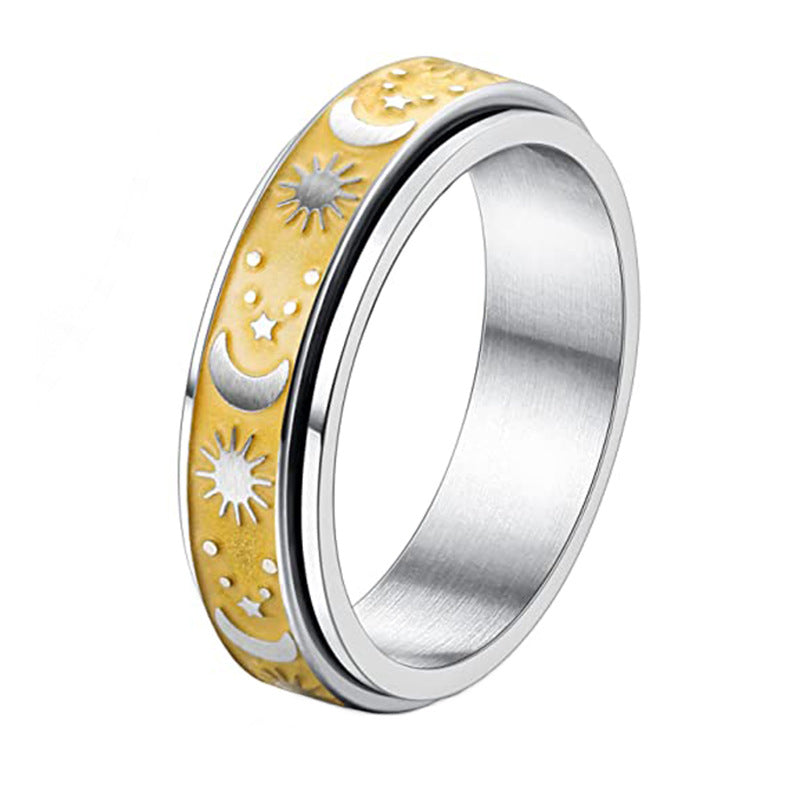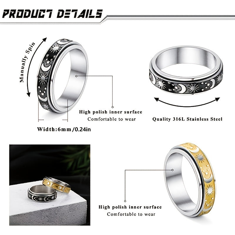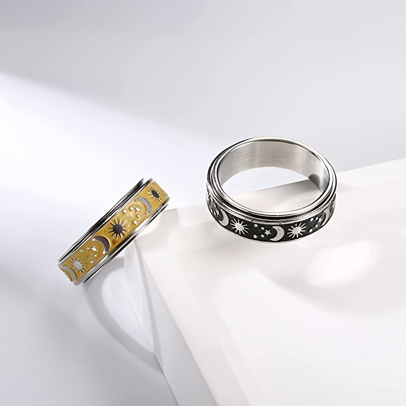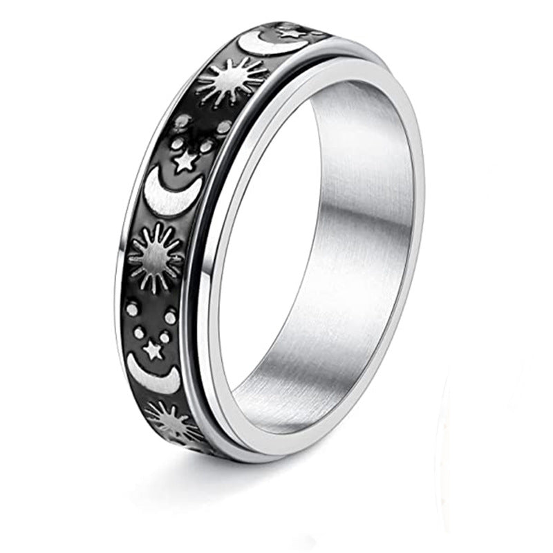 This titanium steel rotating ring features a design of sun, moon, and stars. It is a perfect decompression ring for both men and women.