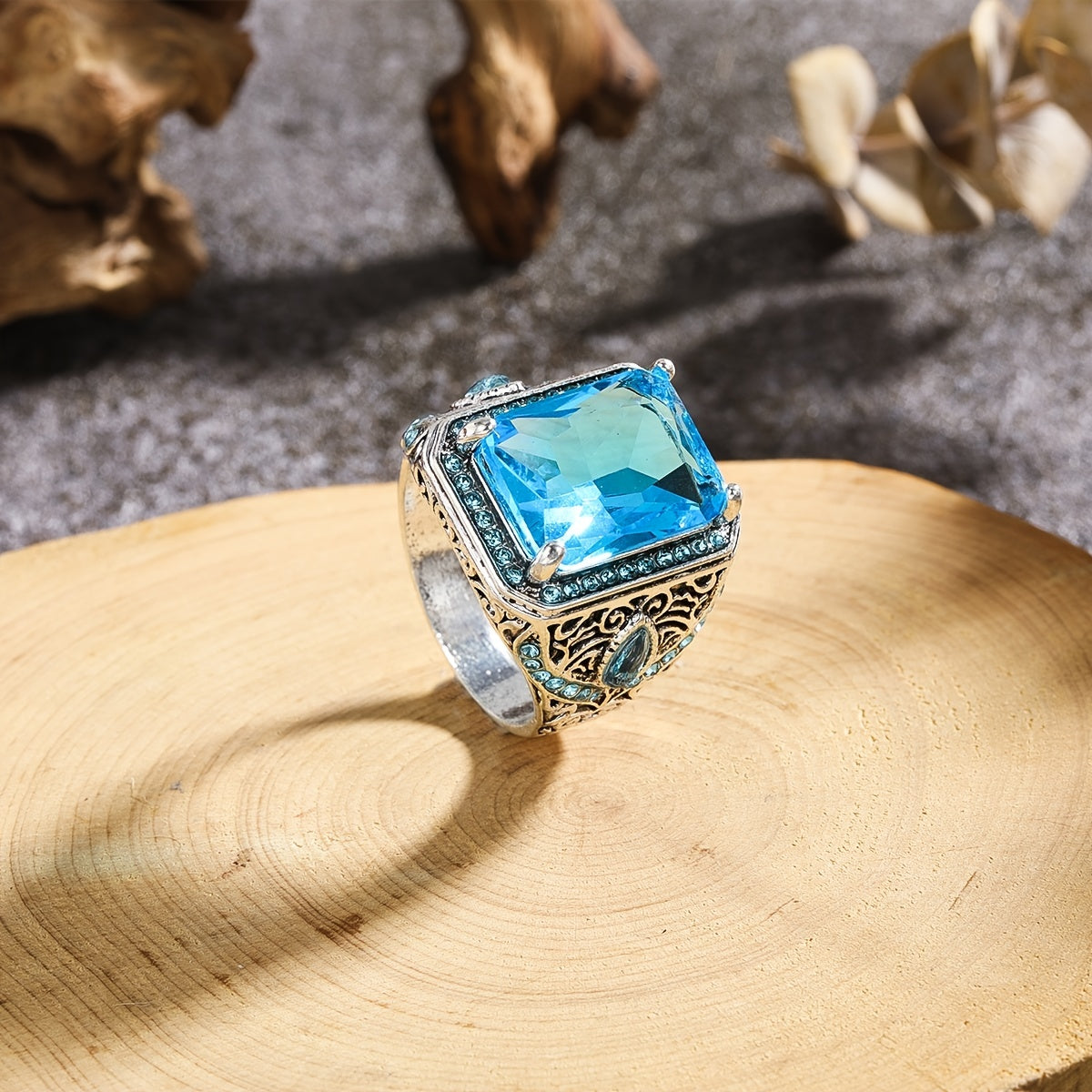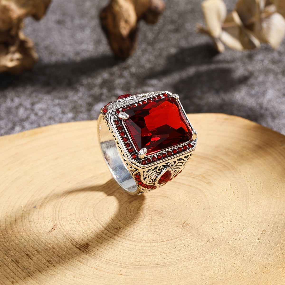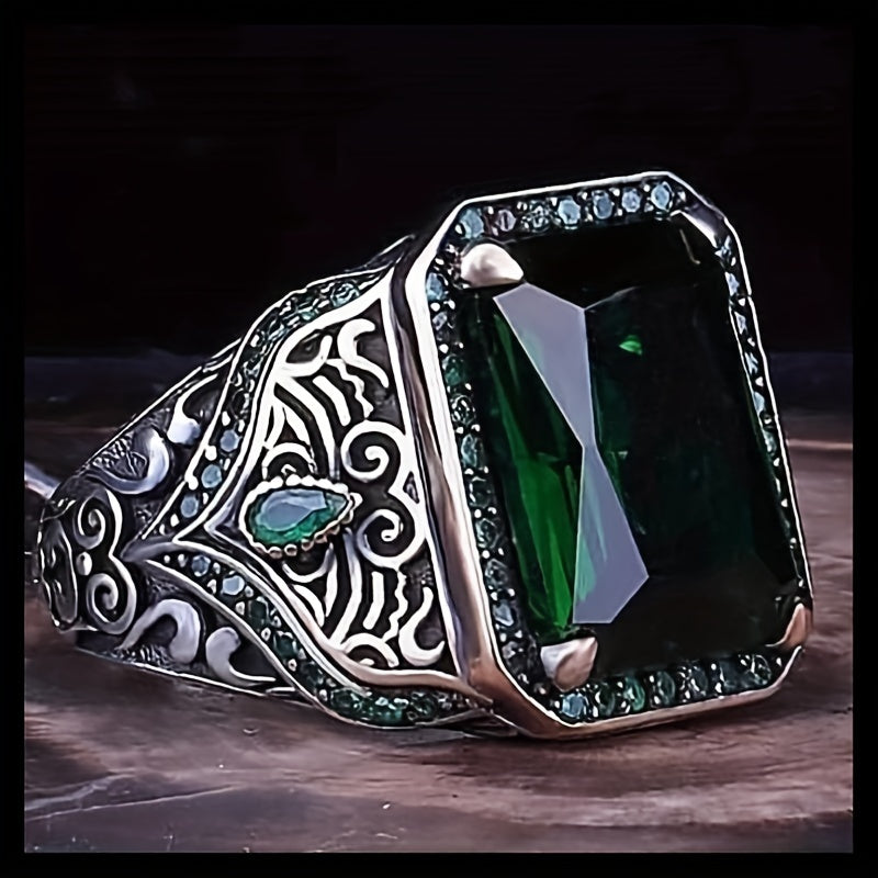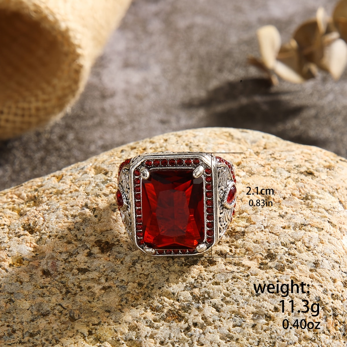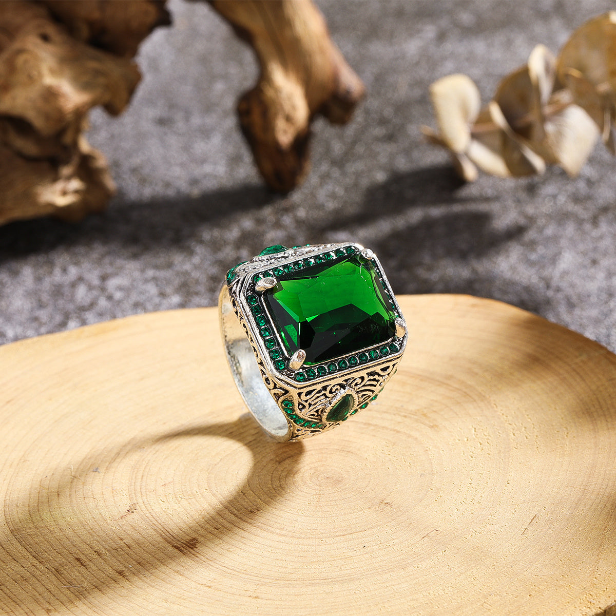 This domineering ring features red and green zircon inlaid in a vintage ethnic style with geometric patterns and texture.