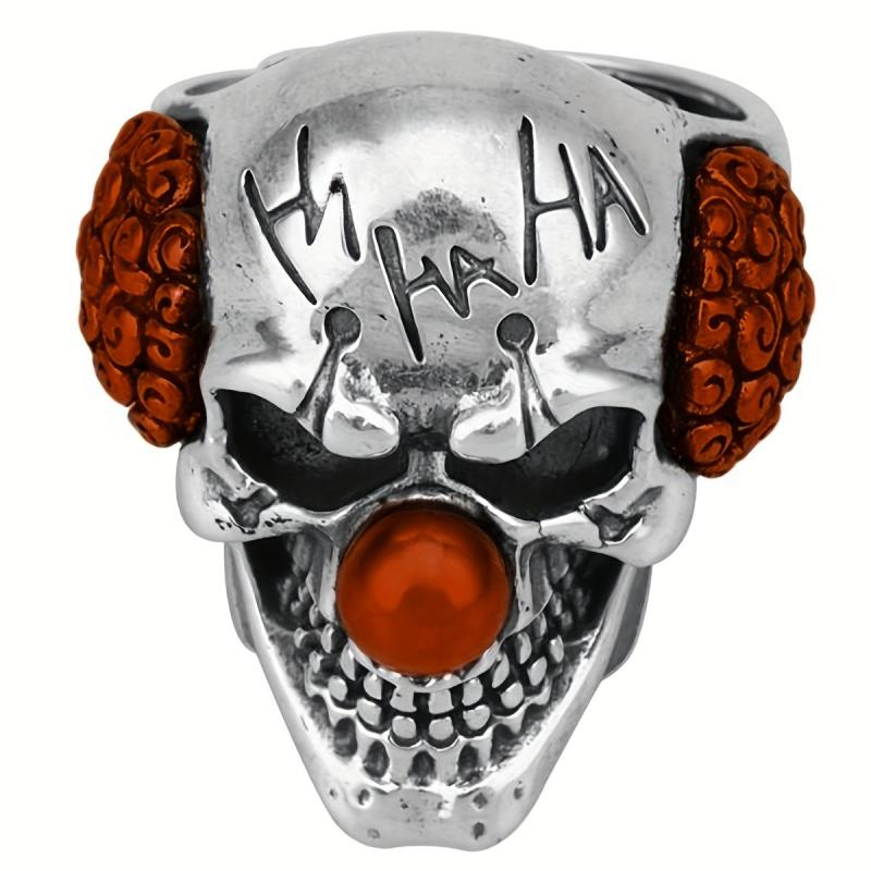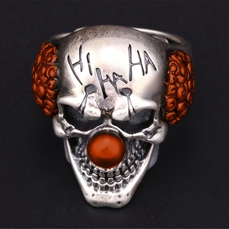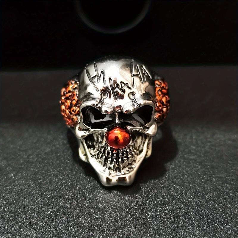 This men's vintage punk skull ring features a unique clown design made of alloy material. It's a statement piece that crosses borders with its distinctive style. Note: Low paint flaws may be present due to vintage nature.