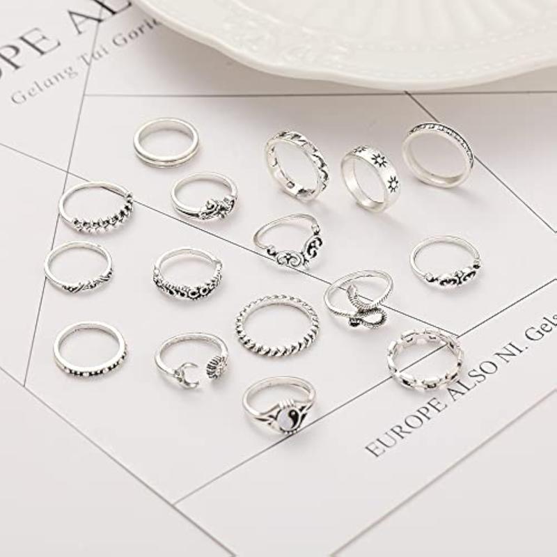 Enhance your boho look with this set of 16 stylish metal midi finger rings. Perfect for adding a touch of elegance to any outfit.