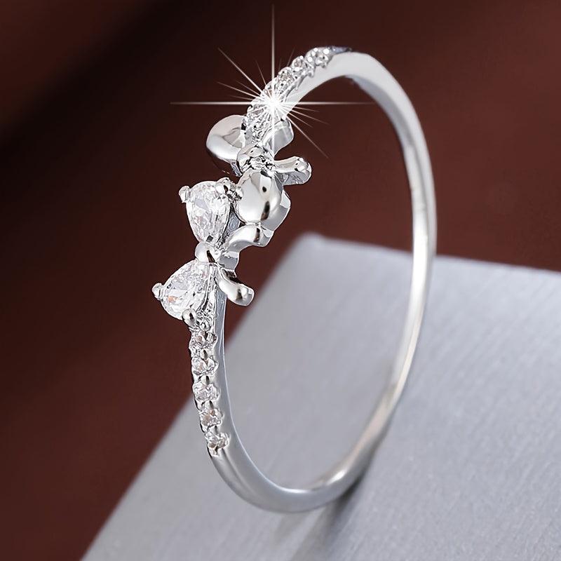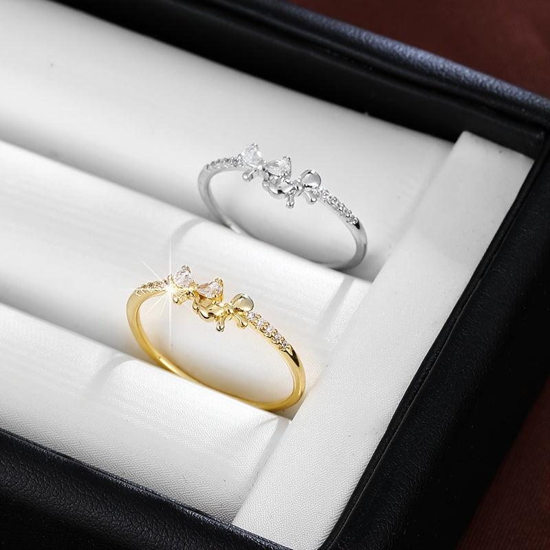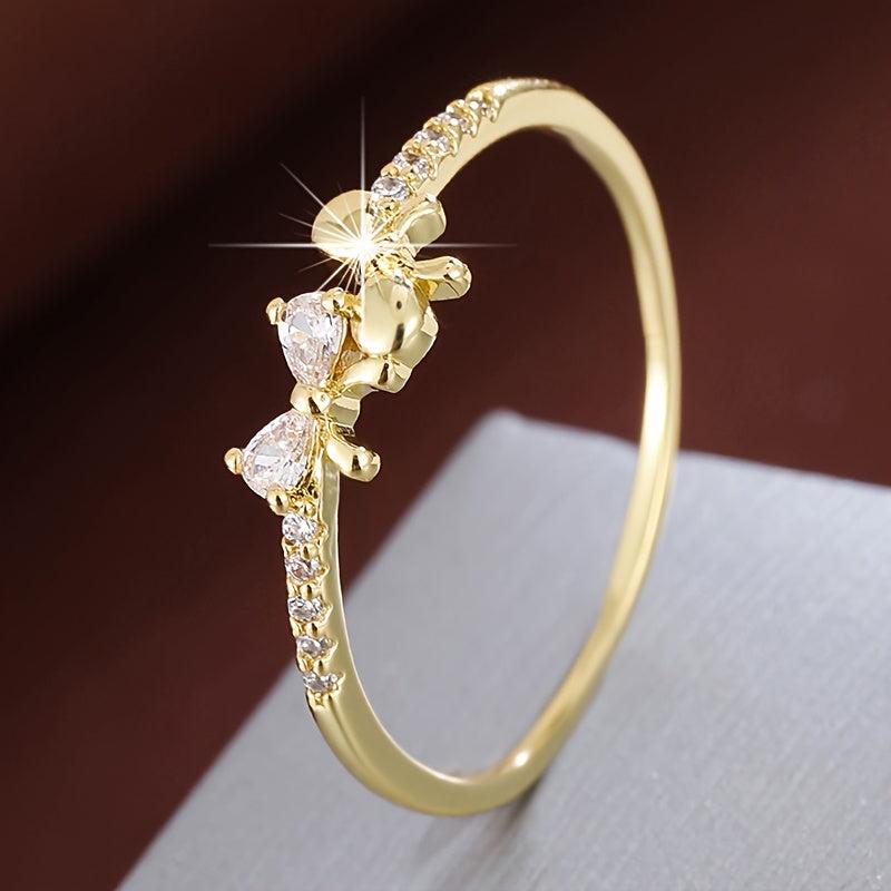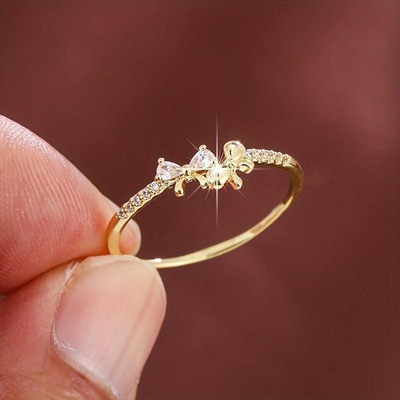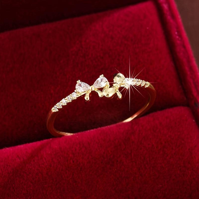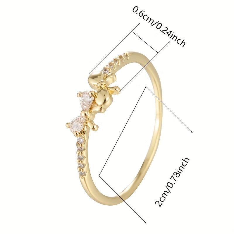 Elevate your style with this chic bow ring featuring three synthetic zirconia stones. Crafted with a golden plated finish, this ring is perfect for casual attire and makes a great gift option.