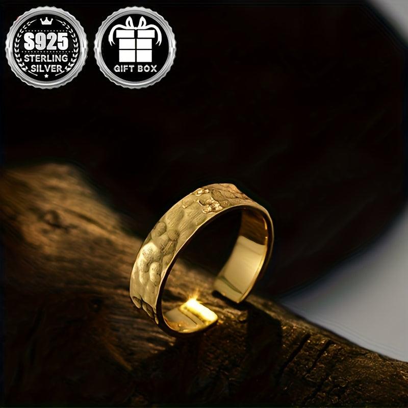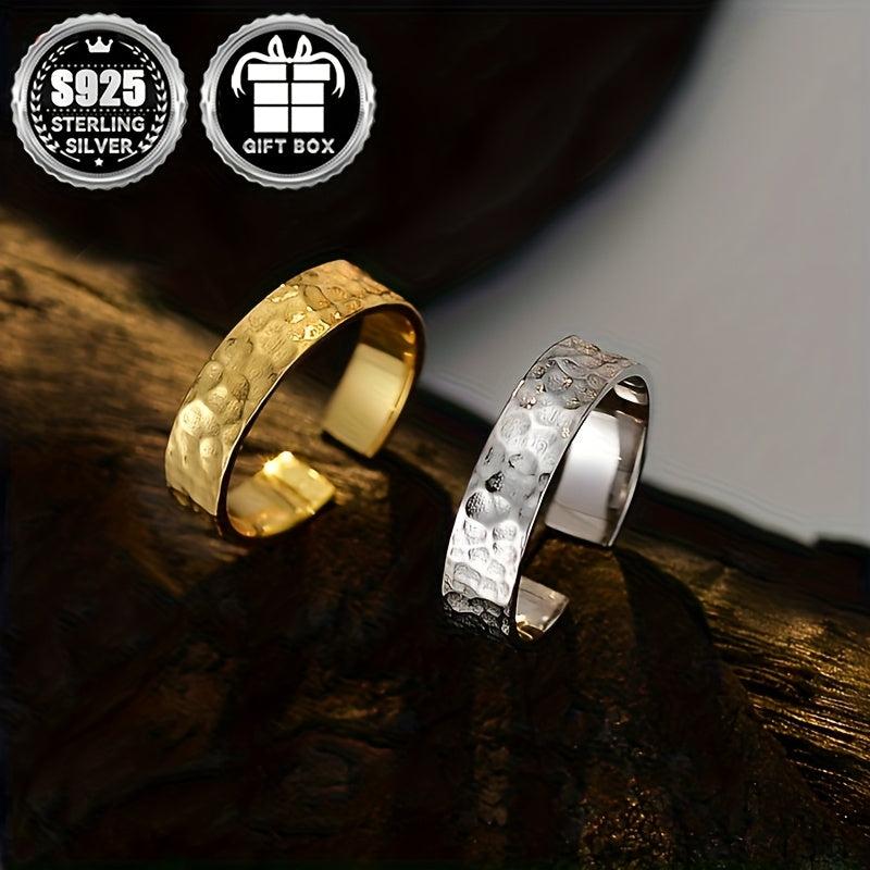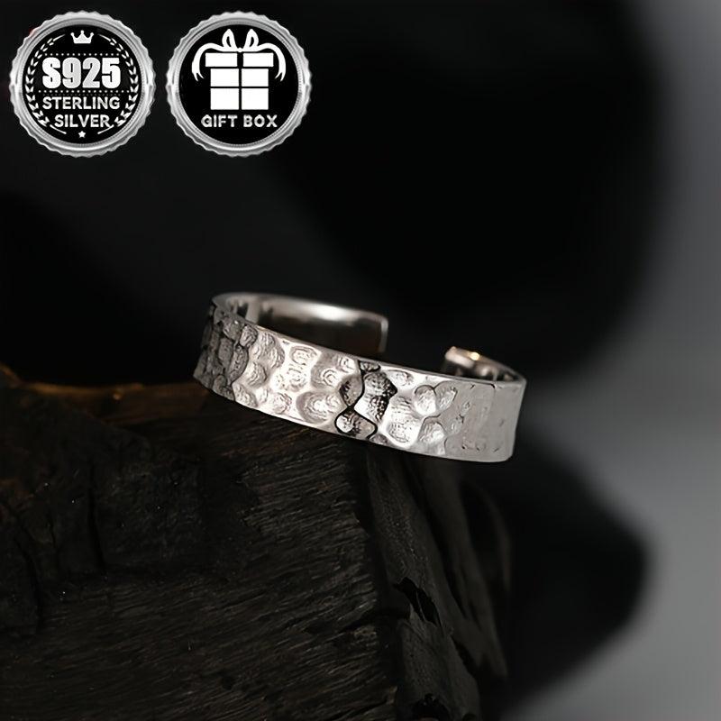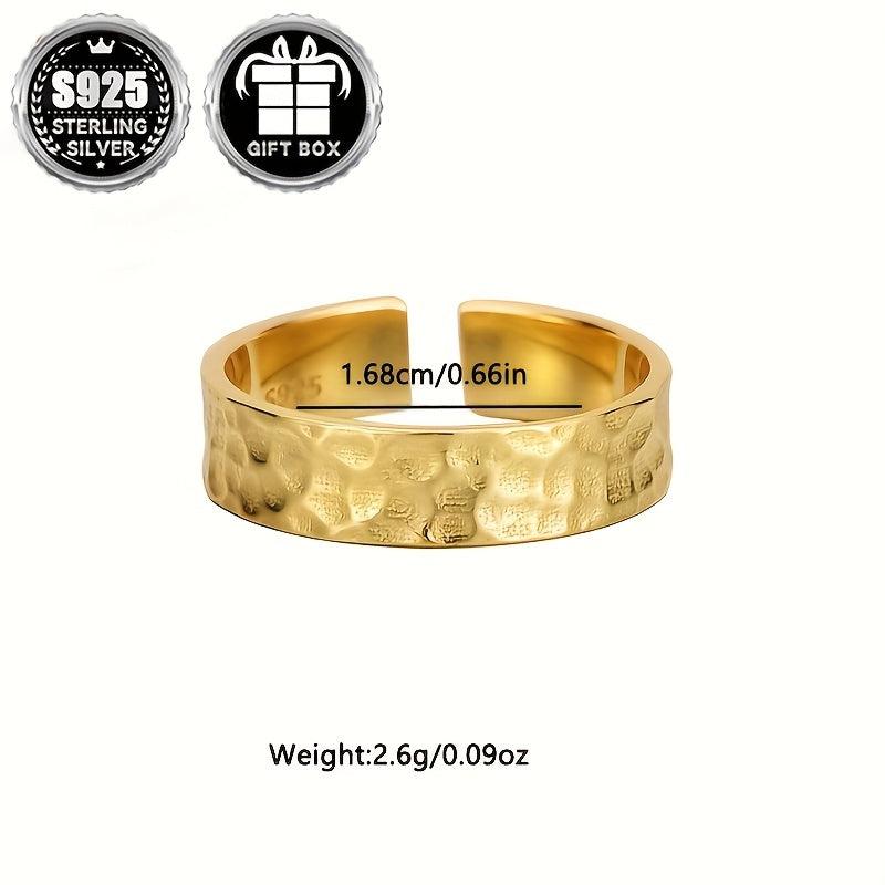 This stylish wide-faced ring for women is crafted from 925 silver with a hammered aluminum foil texture. It features an adjustable opening and weighs 2.6 grams.
