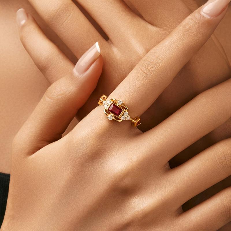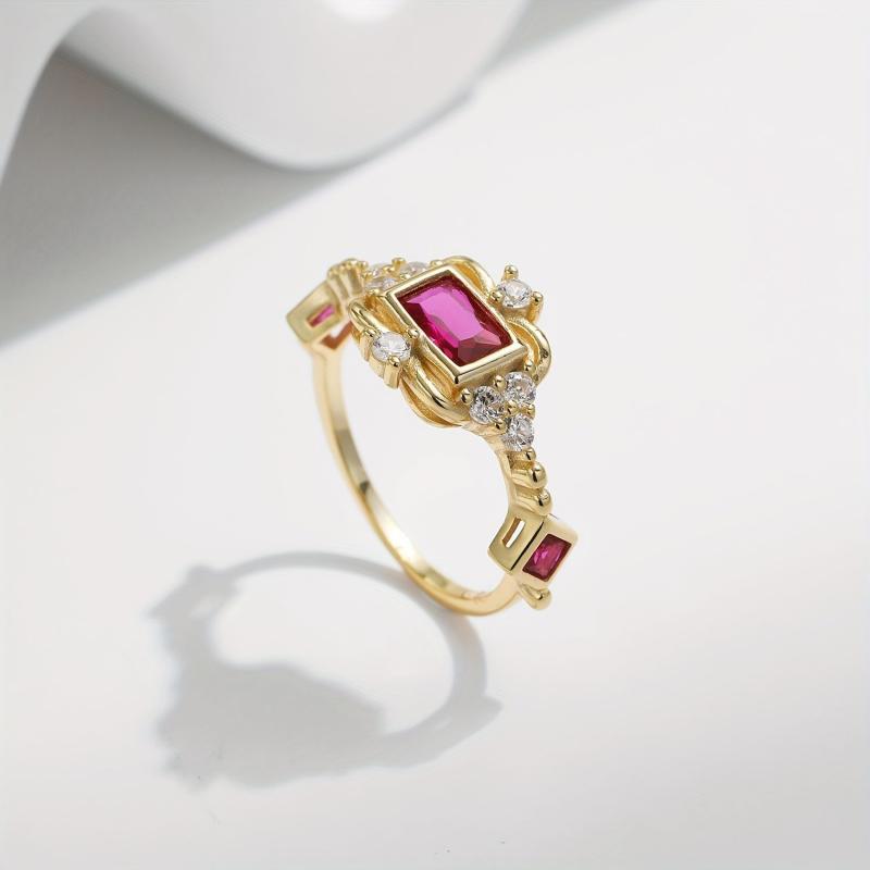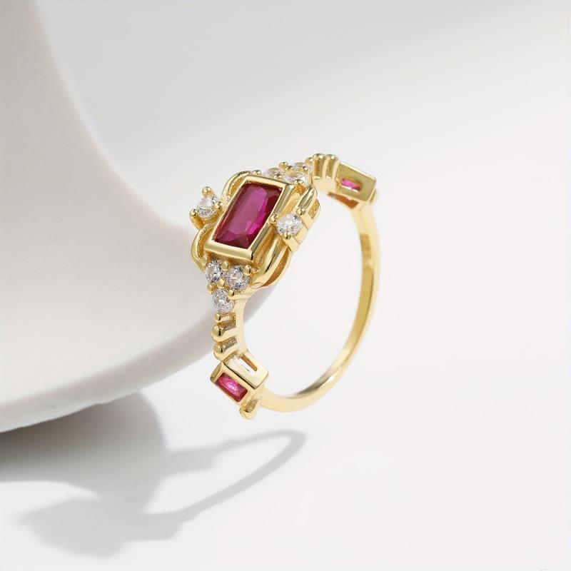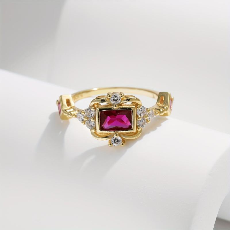 Add a touch of vintage elegance with this stunning crown ring featuring red zirconia stones. The 925 silver band is plated in 18K gold for a luxurious look that is perfect for stacking or wearing alone.
