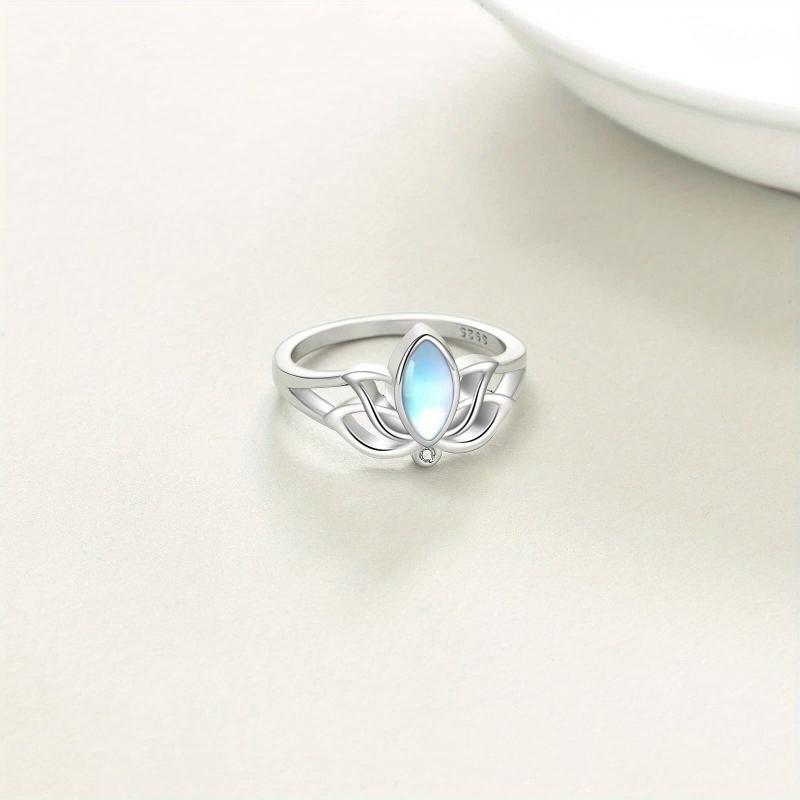 This elegant sterling silver ring features a stunning moonstone set in a lotus flower design. Perfect for adding a touch of natural beauty to your look.