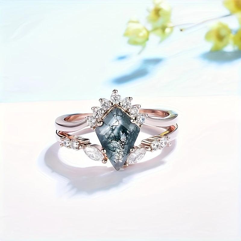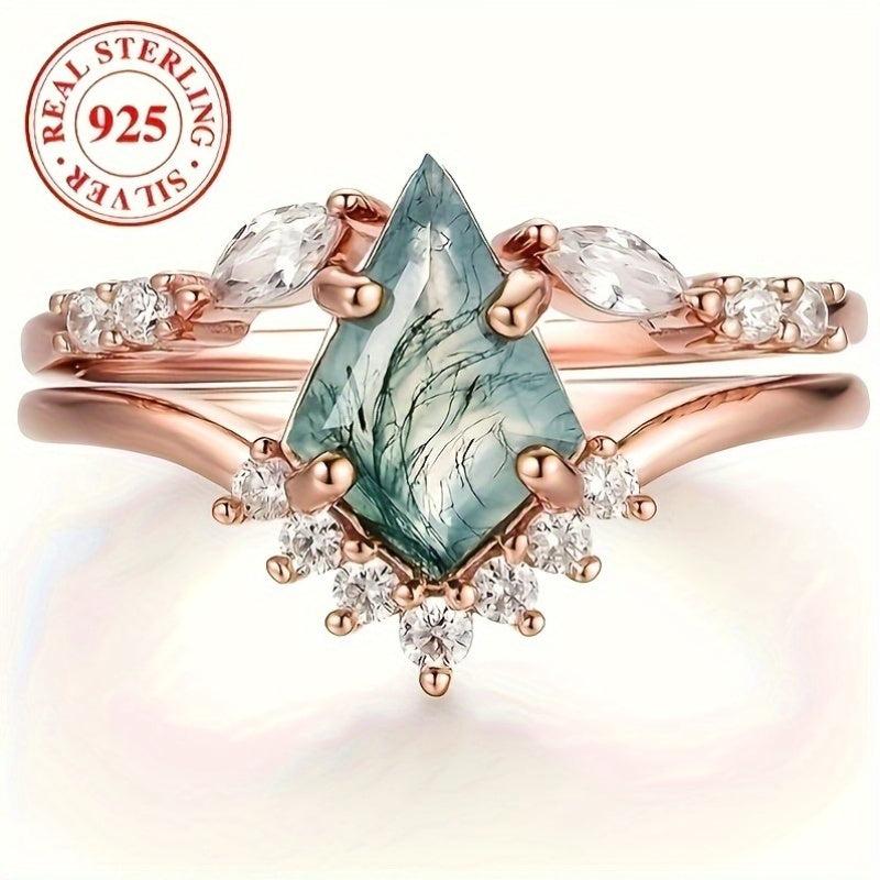 Elegant two-piece set of rings crafted from natural water grass agate and high-quality S925 sterling silver. Perfect for women looking for a stylish and sexy engagement or wedding ring idea.