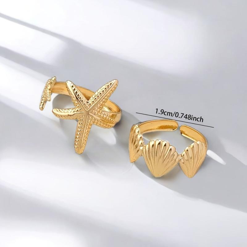 Enhance your beach vacation style with this set of 2 ocean-inspired rings featuring shells and starfish. Perfect for a day at the beach or casual wear.