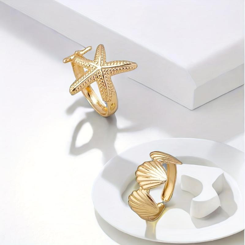 Ocean Shell Starfish Open Rings Set for Women - Beach Vacation Accessories