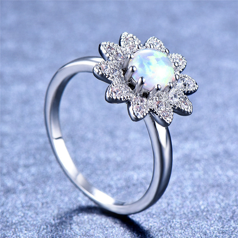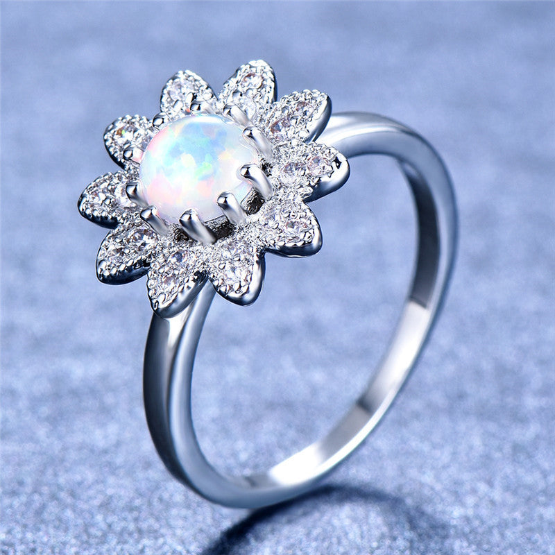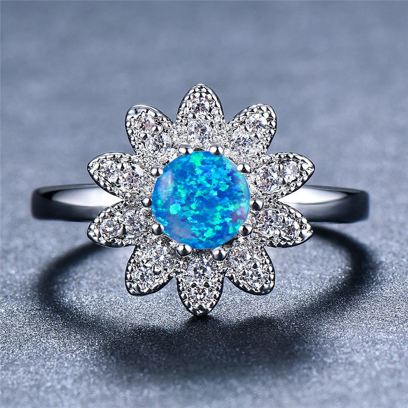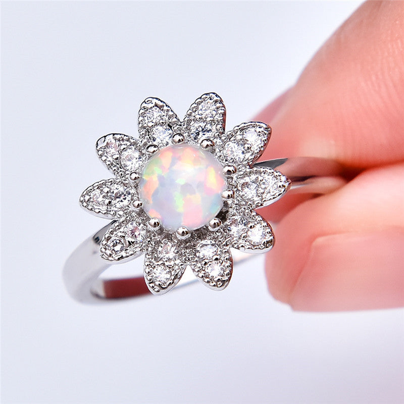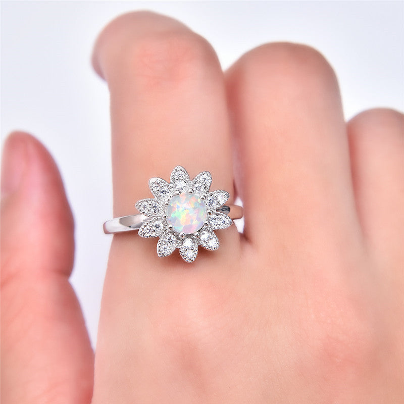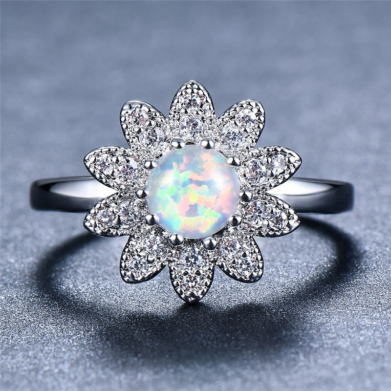 Exquisite flower inlaid opal sunset promise ring, perfect for engagement, wedding or special occasions. Plated with 18k gold, this dainty accessory shines elegantly.