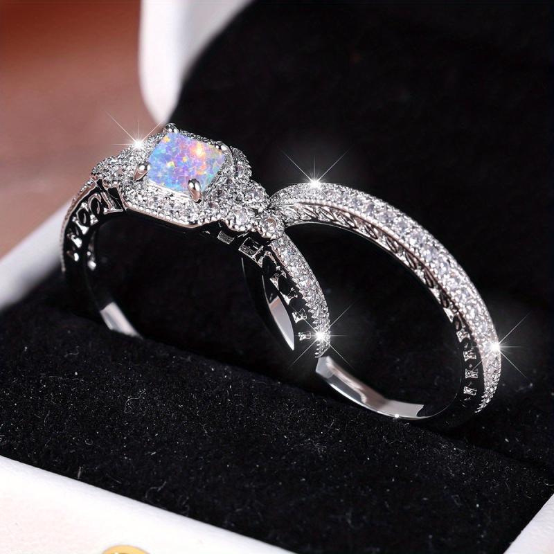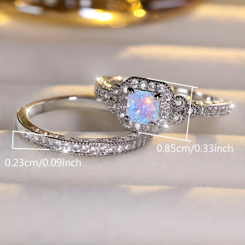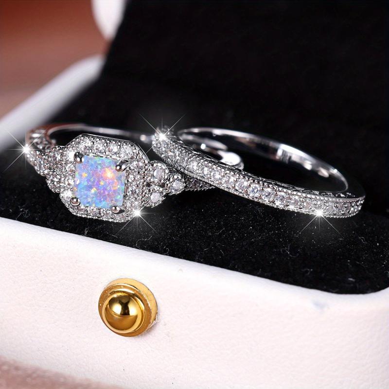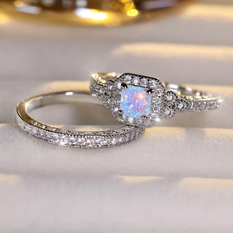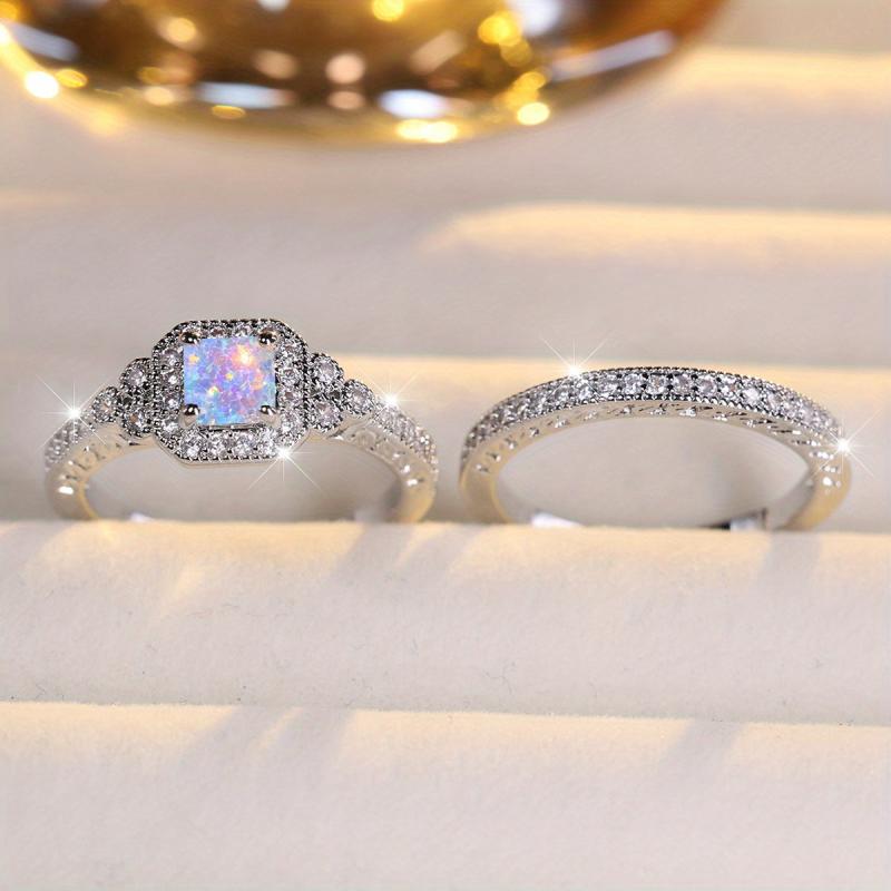 Beautiful bridal wedding couple rings set featuring opal and zirconia stones.