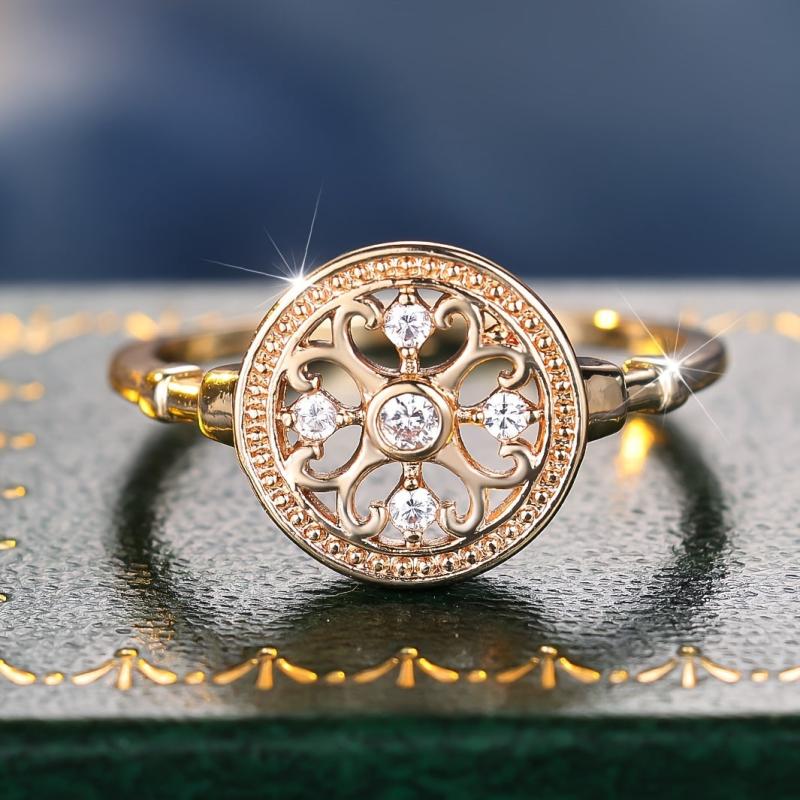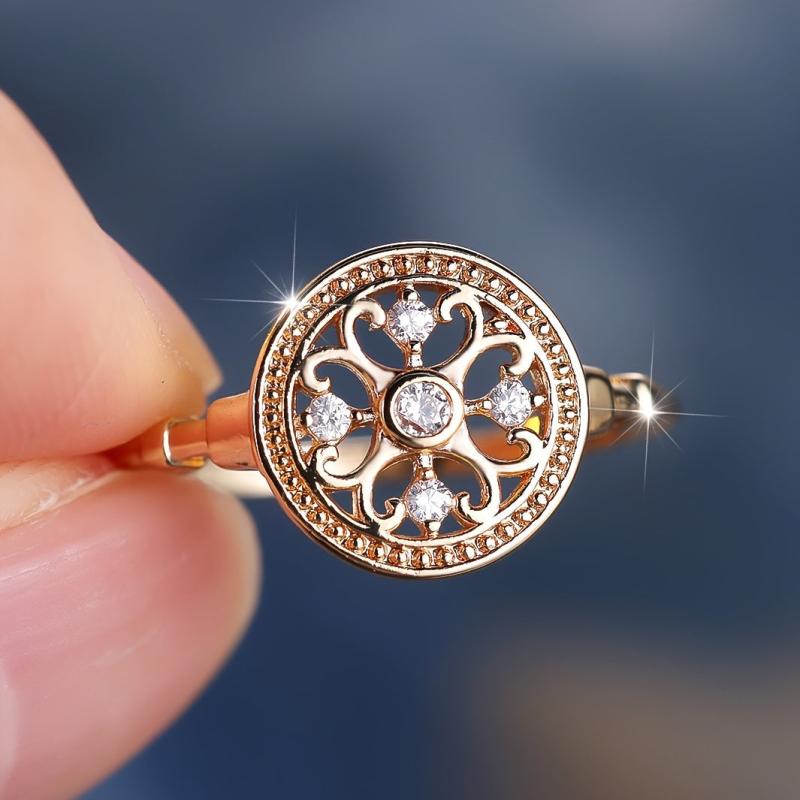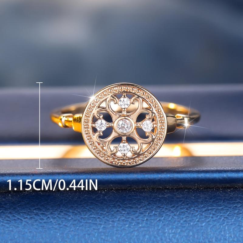 This exquisite ring features a palace-style design with intricate hollow floral patterns, perfect for banquets and weddings.