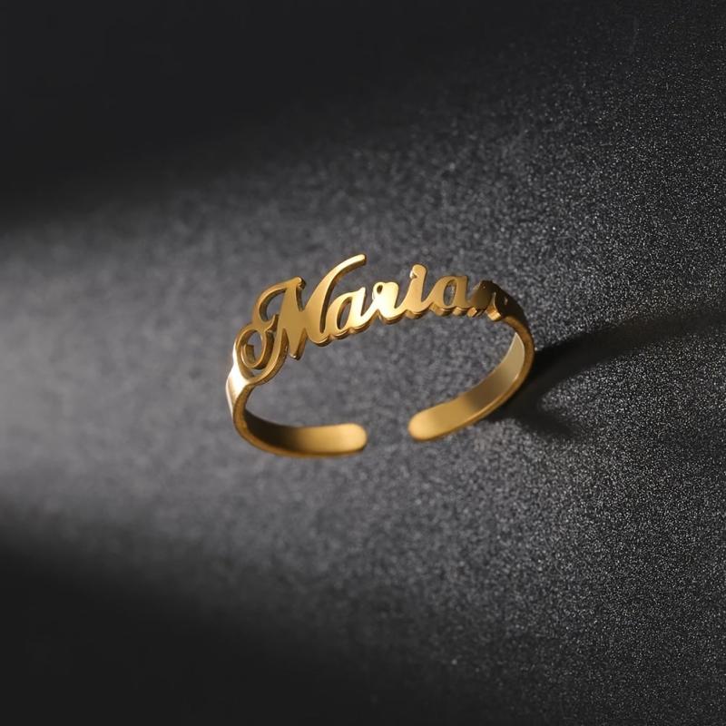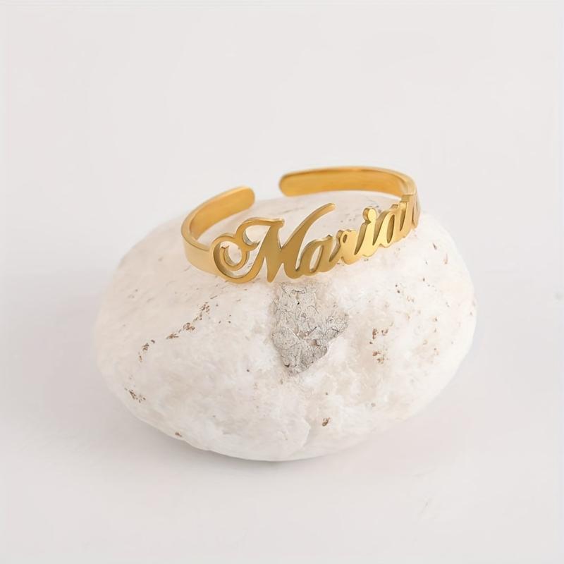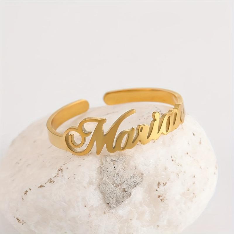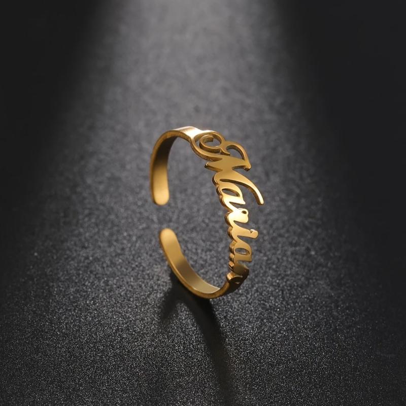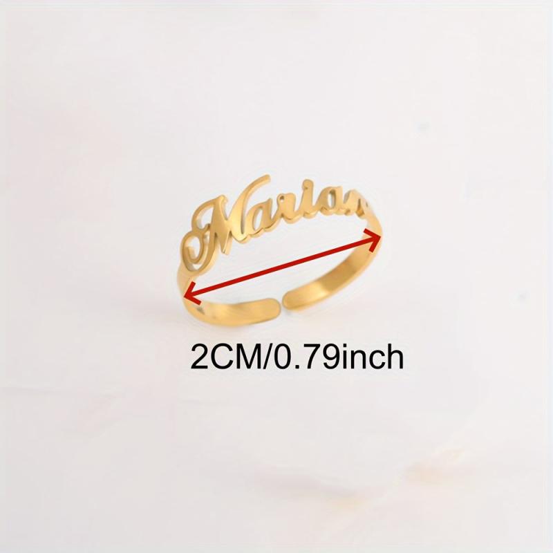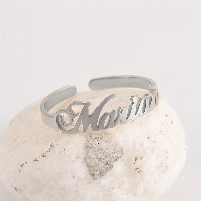 This open-ended ring is made of high-quality stainless steel, perfect for daily wear. It features a customizable name design and has no plating or mosaic material.