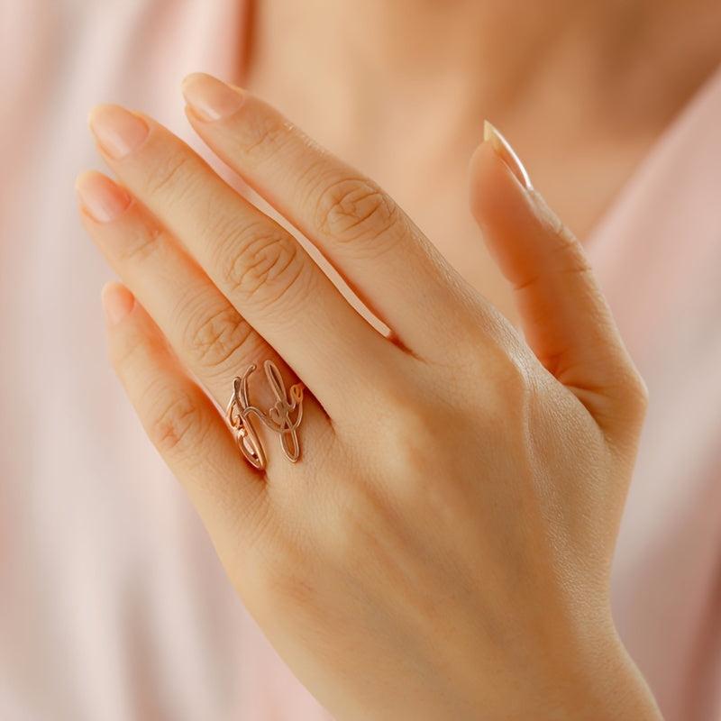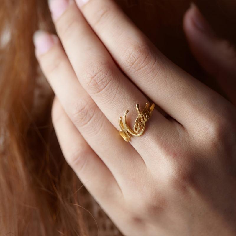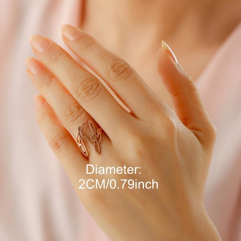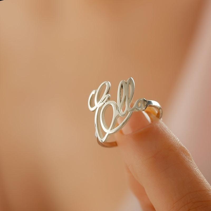 This stylish and unique ring features a personalized cursive name design, made of high-quality stainless steel. The ring is adjustable and comes in a beautiful golden and rose gold finish.
