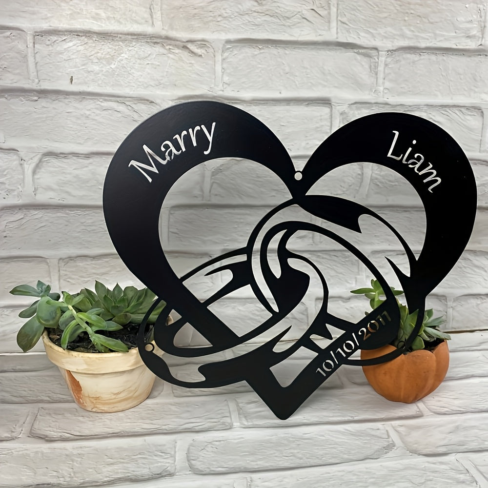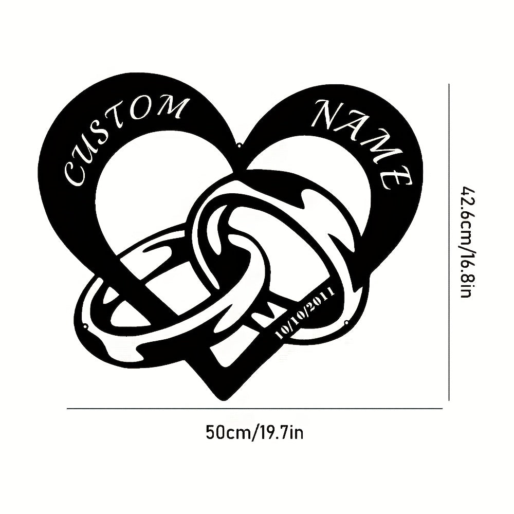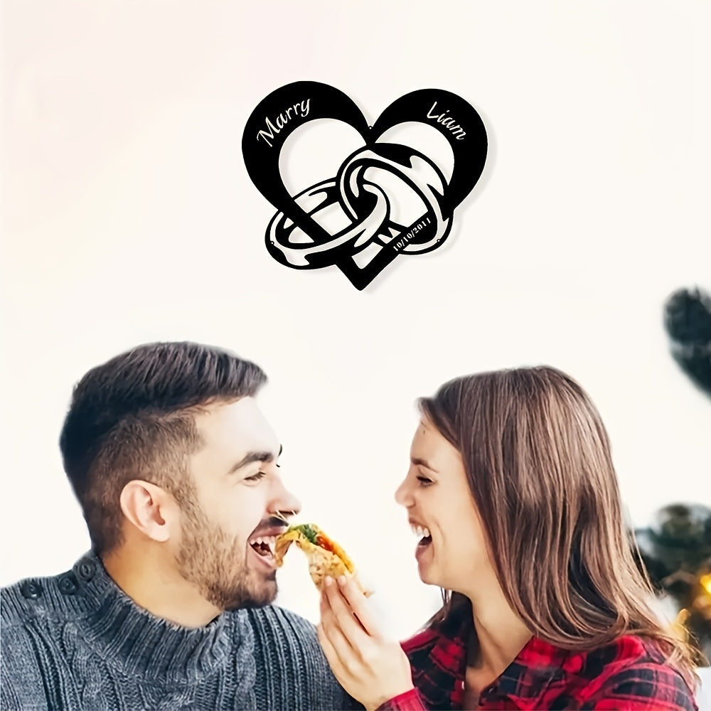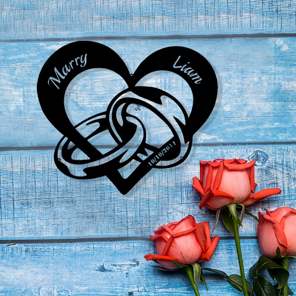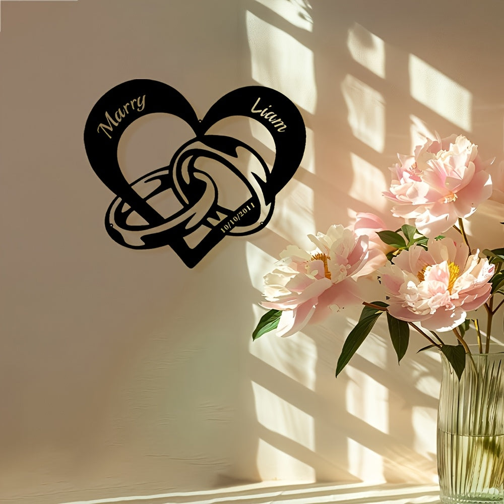 This customizable modern metal heart-shaped wall decoration features interlocking rings personalized with couple's names and dates, making it perfect for Christmas gifts or home decor.