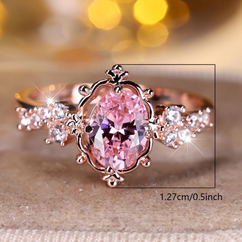 This stunning eternity engagement ring features a pink cubic zirconia stone on a copper band with sparkling rhinestones. Perfect for Valentine's Day or weddings.